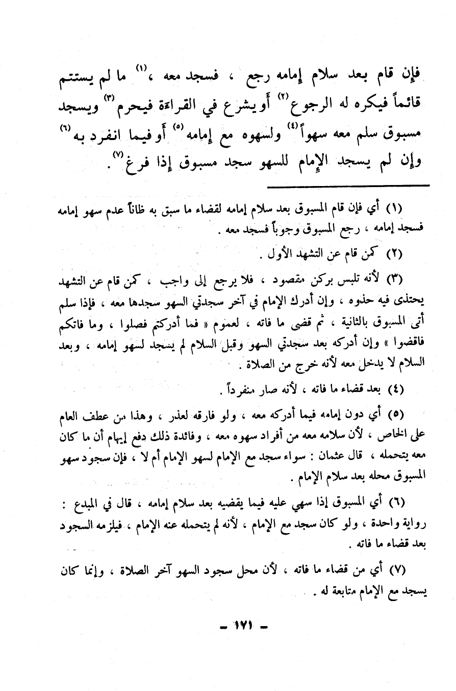 (¬7) أي: من قضاء ما فاته، لأن محل سجود السهو آخر الصلاة، وإنما كان يسجد مع الإمام متابعة له.