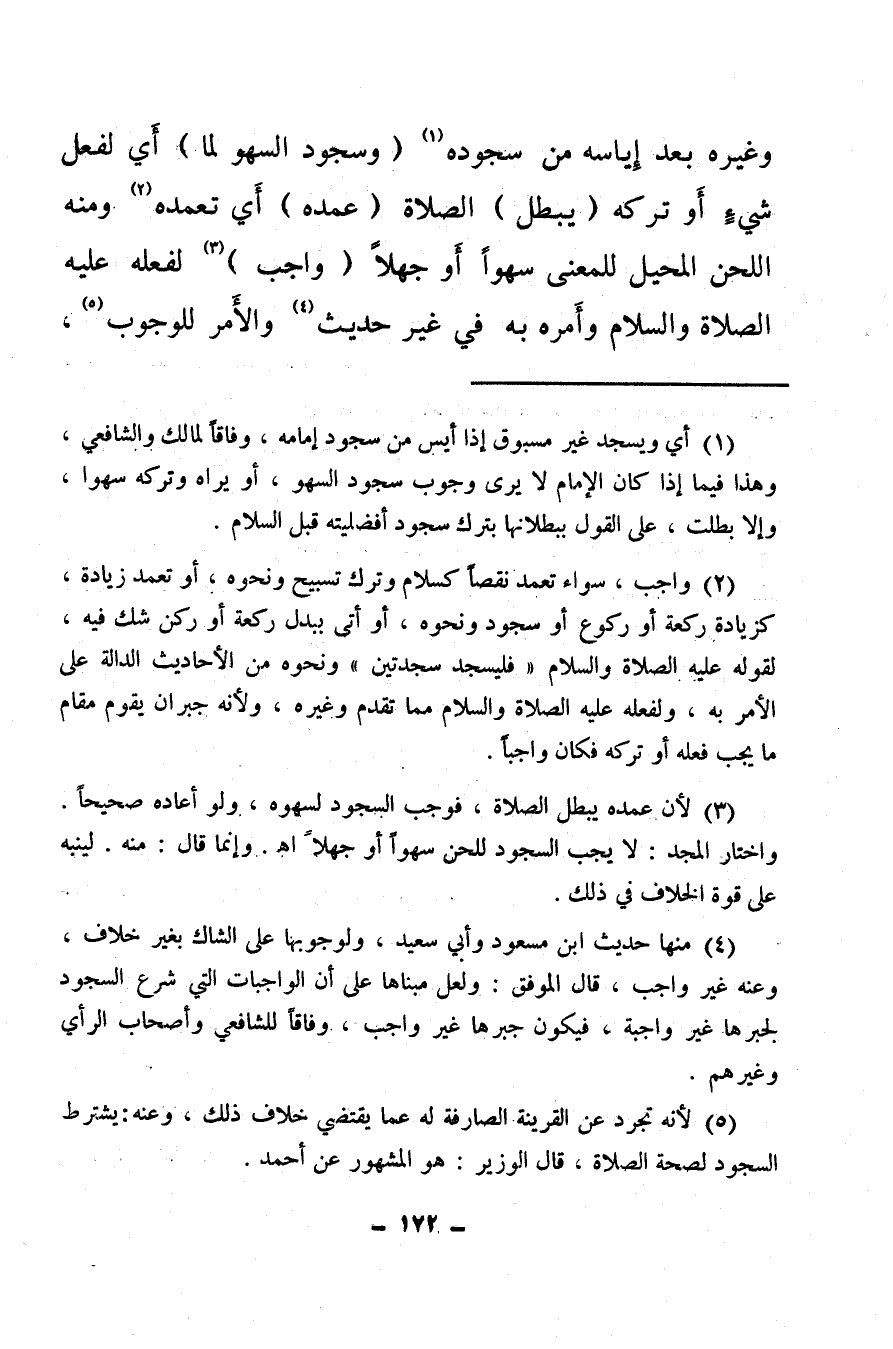(¬2) واجب سواء تعمد نقصا كسلام وترك تسبيح ونحوه، أو تعمد زيادة كزيادة ركعة أو ركوع أو سجود ونحوه، أو أتى ببدل ركعة أو ركن شك فيه، لقوله عليه الصلاة والسلام «فليسجد سجدتين» ونحوه من الأحاديث الدالة على الأمر به، ولفعله عليه الصلاة والسلام مما تقدم وغيره، ولأنه جبران يقوم مقام ما يجب فعله أو تركه فكان واجبا.