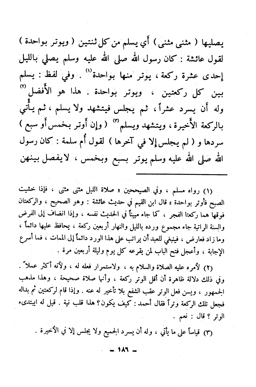 (¬1) رواه مسلم، وفي الصحيحين «صلاة الليل مثنى مثنى، فإذا خشيت الصبح فأوتر بواحدة» قال ابن القيم في حديث عائشة، وهو الصحيح والركعتان فوقها هما ركعتا الفجر، كما جاء مبينا في الحديث نفسه، وإذا انضاف إلى الفرض والسنة الراتبة جاء مجموع ورده بالليل والنهار أربعين ركعة، يحافظ عليها دائما، وما زاد فعارض، فينبغي للعبد أن يراتب على هذا الورد دائما إلى الممات، فما أسرع الإجابة، وأعجل فتح الباب لمن يقرعه كل يوم وليلة أربعين مرة.
