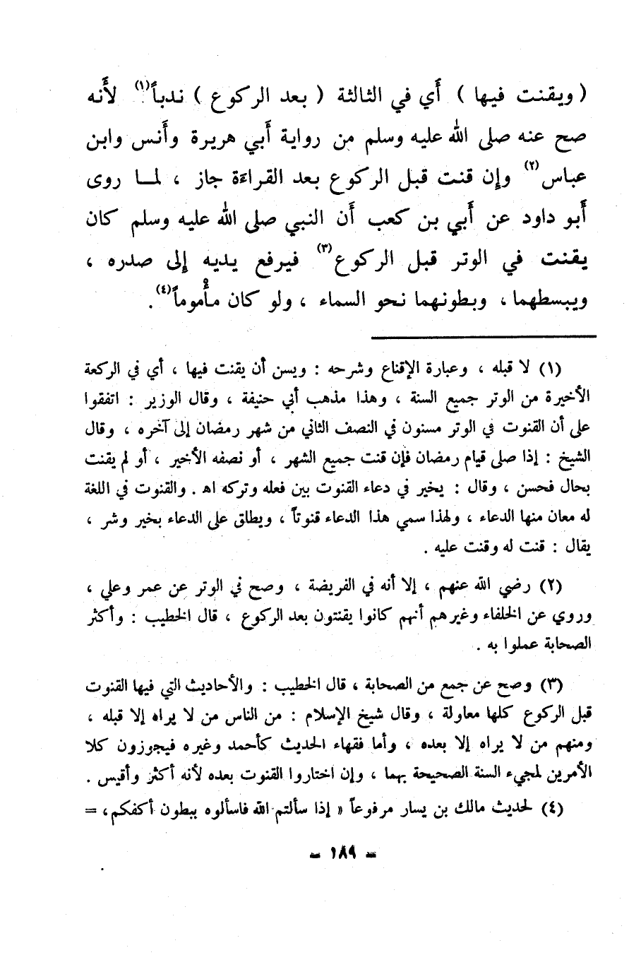 (¬3) وصح عن جمع من الصحابة، قال الخطيب: والأحاديث التي فيها القنوت قبل الركوع كلها معاولة وقال شيخ الإسلام: من الناس من لا يراه إلا قبله، ومنهم من لا يراه إلا بعده، وأما فقهاء الحديث كأحمد وغيره فيجوزون كلا الأمرين لمجيء السنة الصحيحة بهما، وإن اختاروا القنوت بعده لأنه أكثر وأقيس.