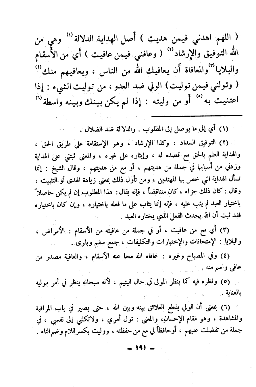(اللهم اهدني فيمن هديت) أصل الهداية الدلالة (¬1) وهي من الله التوفيق والإرشاد (¬2) (وعافاني فيمن عافيت) أي من الأسقام والبلايا (¬3) والمعافاة أن يعافيك الله من الناس، ويعافيهم منك (¬4) (وتولني فيمن توليت) الولي ضد العدو، من توليت الشيء: إذا اعتنيت به (¬5) أو من وليته: إذا لم يكن بينك وبينه واسطة (¬6) .