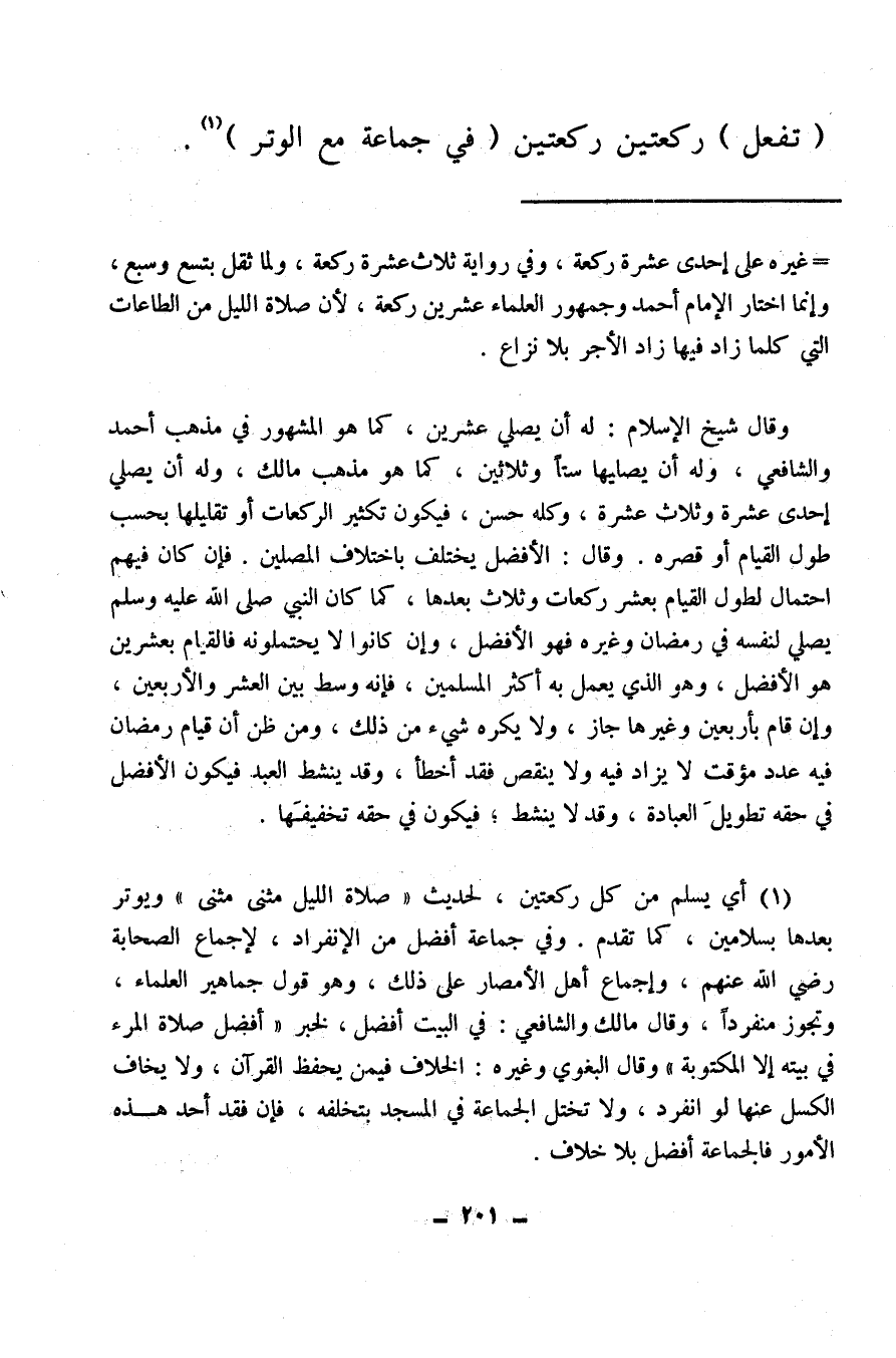 (¬1) أي يسلم من كل ركعتين، لحديث «صلاة الليل مثنى مثنى» ، ويوتر بعدهابسلامين كما تقدم، وفي جماعة أفضل من الانفراد لإجماع الصحابة رضي الله عنهم، وإجماع أهل الأمصار على ذلك، وهو قول جماهير العلماء، وتجوز منفردًا، وقال مالك والشافعي: في البيت أفضل لخبر «أفضل صلاة المرء في بيته إلا المكتوبة» وقال البغوي وغيره: الخلاف فيمن يحفظ القرآن، ولا يخاف الكسل عنها لو انفرد، ولا تختل الجماعة في المسجد بتخلفه، فإن فقد أحد هذه الأمور فالجماعة أفضل بلا خلاف.