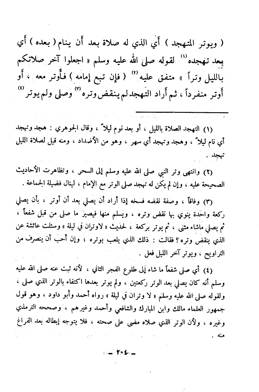 (¬4) أي صلى شفعًا ما شاء إلى طلوع الفجر الثاني، لأنه ثبت عنه صلى الله عليه وسلم أنه كان يصلي بعد الوتر ركعتين، ولم يوتر بعدها اكتفاء بالوتر الذي صلى، ولقوله صلى الله عليه وسلم، «لا وتران في ليلة» ، رواه أحمد وأبو داود، وهو قول جمهور العلماء مالك وابن المبارك والشافعي وأحمد وغيرهم، وصححه الترمذي وغيره، ولأن الوتر الذي صلاه مضى على صحته، فلا يتوجه إبطاله بعد الفراغ منه.