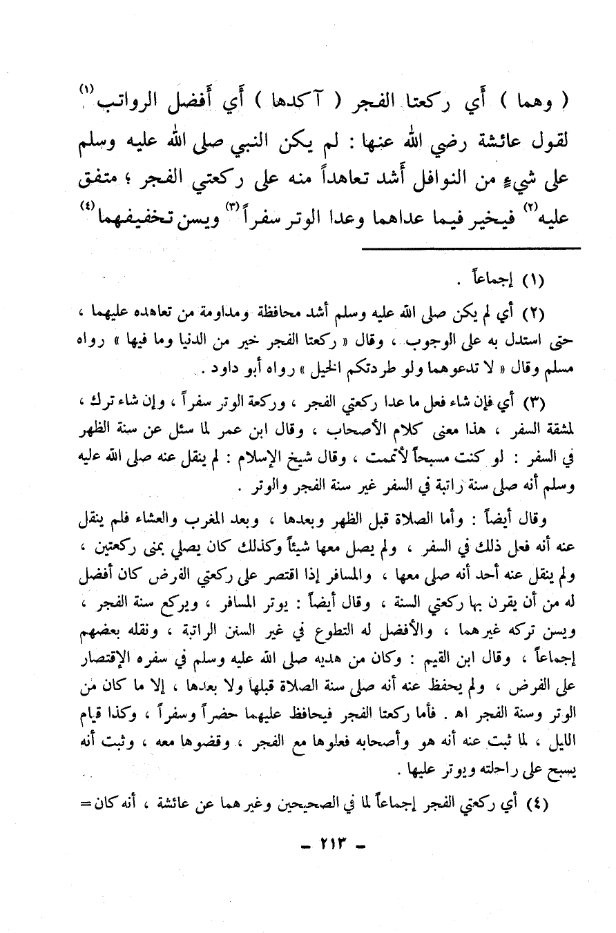 (¬3) أي فإن شاء فعل ما عدا ركعتي الفجر، وركعة الوتر سفرا، وإن شاء ترك، لمشقة السفر، هذا معنى كلاما لأصحاب، وقال ابن عمر لما سئل عن سنة الظهر في السفر: لو كنت مسبحا لأتممت وقال شيخ الإسلام: لم ينقل عنه صلى الله عليه وسلم أنه صلى سنة راتبة في السفر غير سنة الفجر والوتر.