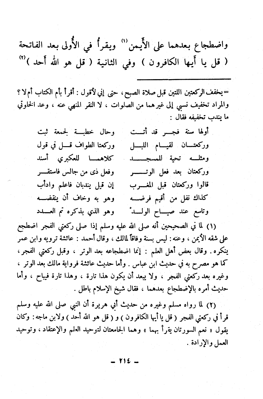 (¬2) لما رواه مسلم وغيره من حديث أبي هريرة أن النبي صلى الله عليه وسلم قرأ في ركعتي (قل يأيها الكافرون) و (قل هو الله أحد) ولابن ماجه: وكان يقول: نعم السورتان يقرأ بهما، وهما الجامعتان لتوحيد العلم، والاعتقاد، وتوحيد العمل والإرادة.