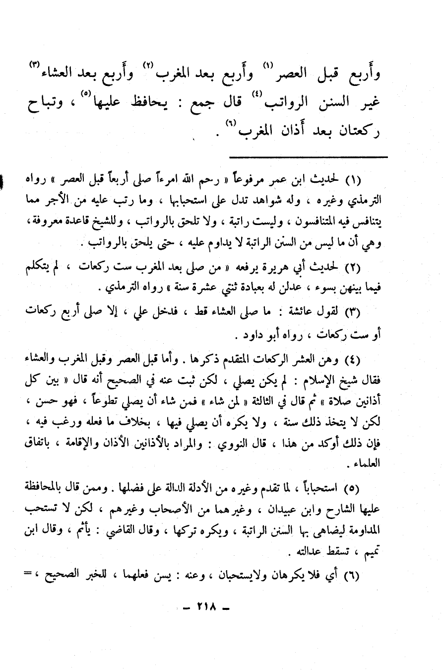 وأربع قبل العصر (¬1) وأربع بعد المغرب (¬2) وأربع بعد العشاء (¬3) غير السنن الرواتب (¬4) قال جمع: يحافظ عليها (¬5) وتباح ركعتان بعد أذان المغرب (¬6) .