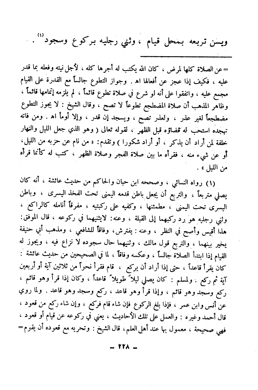 (¬1) رواه النسائي، وصححه ابن حبان والحاكم من حديث عائشة، أنه كان يصلي متربعا، والتربع أن يجعل باطن قدمه اليمنى تحت الفخذ اليسرى، وباطن اليسرى تحت اليمنى، مطمئنا وكفيه على ركبتيه مفرقا أنامله كالراكع، وثني رجليه هو رد ركبهما إلى القبلة، وعنه: لا يثنيهما في ركوعه، قال الموفق: هذا أقيس وأصح في النظر، وعنه: يفترش، وفاقا للشافعي، ومذهب أبي حنيفة يخير بينهما، والتربع قول مالك، وثنيهما حال سجوده لا نزاع فيه، ويجوز له القيام إذا ابتدأ الصلاة جالسا، وعكسه وفاقا، لما في الصحيحين من حديث عائشة كان يقرأ قاعدا حتى إذا أراد أن يركع قام فقرأ نحوا من ثلاثين آية أو أربعين آية ثم ركع، ولمسلم، كان يصلي ليلا طويلا قاعدا وكان إذا قرأ وهو قائم ركع وسجد وهو قائم، وإذا قرأ وهو قاعد، ركع وسجد وهو قاعد، ولما روي عن أنس وابن عمر، فإذا بلغ الركوع فإن شاء قام فركع، وإن شاء ركع من قعود، قال أحمد وغيره، والعمل على تلك الأحاديث يعني في ركوعه عن قيام أو قعود فهي صحيحة، معمول بها عند أهل العلم قال الشيخ: وتحريه مع قعوده أن يقوم