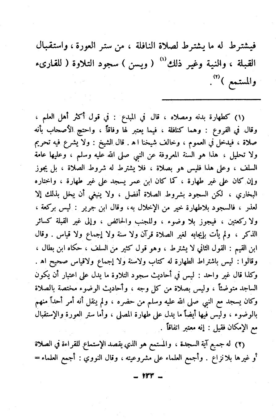 وقال ابن القيم: القول الثاني لا يشترط وهو قول كثير من السلف، حكاه ابن بطال، وقالوا: ليس باشتراط الطهارة له كتاب ولا سنة ولا إجماع ولا قياس صحيح اهـ، وكذا قال غير واحد، ليس في أحاديث سجود التلاوة ما يدل على اعتبار أن يكون الساجد متوضئا، وليس بصلاة من كل وجه، وأحاديث الوضوء مختصة بالصلاة وكان يسجد مع النبي صلى الله عليه وسلم من حضره، ولم ينقل أنه أمر أحدا منهم بالوضوء، وليس فيها أيضا ما يدل على طهارة المصلي، وأما ستر العورة والاستقبال مع الإمكان فقيل: إنه معتبر اتفاقا.