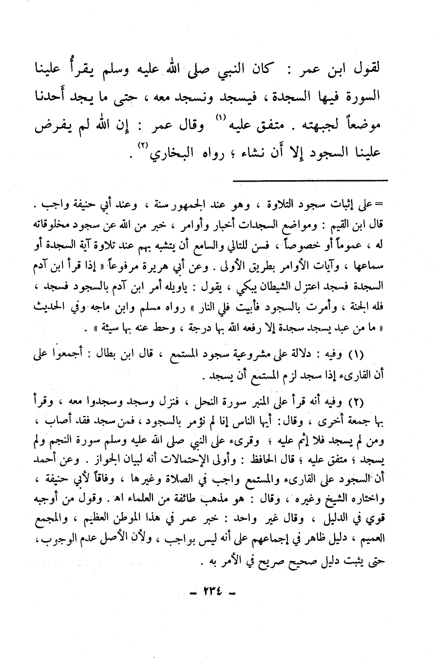 (¬2) وفيه أنه قرأ على المنبر سورة النحل، فنزل وسجد وسجدوا معه، وقرأ بها جمعة أخرى، وقال: أيها الناس إنا لم نؤمر بالسجود، فمن سجد فقد أصاب، ومن لم يسجد فلا إثم عليه، وقرئ على النبي صلى الله عليه وسلم سورة النجم ولم يسجد، متفق عليه، قال الحافظ: وأولى الاحتمالات أنه لبيان الجواز، وعن أحمد أن السجود على القارئ والمستمع واجب في الصلاة وغيرها، وفاقا لأبي حنيفة واختاره الشيخ وغيره، وقال: وهو مذهب طائفة من العلماء اهـ، وقول من أوجبه قوي في الدليل، وقال غير واحد: خبر عمر في هذا الموطن العظيم، والمجمع العميم، دليل ظاهر في إجماعهم على أنه ليس بواجب، ولأن الأصل عدم الوجوب حتى يثبت دليل صحيح صريح في الأمر به.