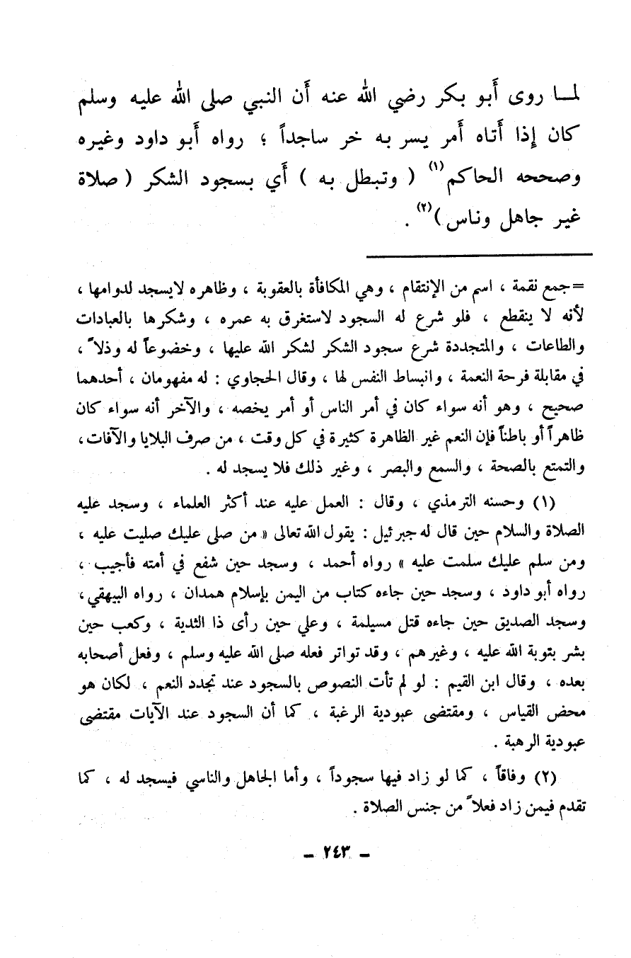 (¬1) وحسنه الترمذي، وقال: العمل عليه عند أكثر العلماء، وسجد عليه الصلاة والسلام حين قال له جبرئيل، يقول الله تعالى «من صلى عليك صليت عليه ومن سلم عليك سلمت عليه» ، رواه أحمد، وسجد حين شفع في أمته فأجيب رواه أبو داود، وسجد حين جاءه كتاب من اليمن بإسلام همدان، رواه البيهقي وسجد الصديق حين جاءه قتل مسيلمة وعلي حين رأى ذا الثدية، وكعب حين بشر بتوبة الله عليه، وغيرهم وقد تواتر فعله صلى الله عليه وسلم وفعل أصحابه بعده وقال ابن القيم: لو لم تأت النصوص بالسجود عند تجدد النعم، لكان هو محض القياس، ومقتضى عبودية الرغبة، كما أن السجود عند الآيات مقتضى عبودية الرهبة.