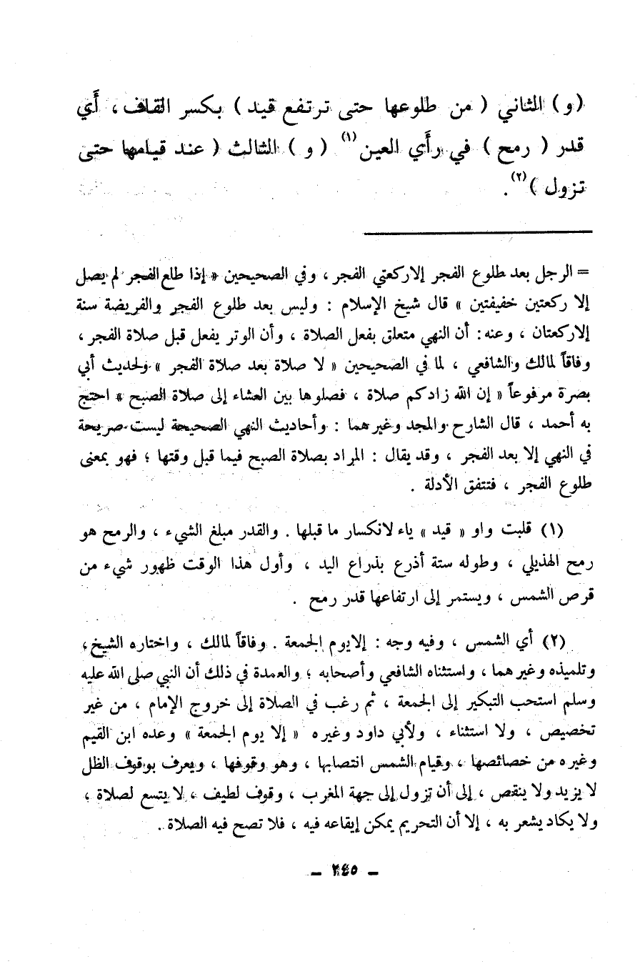 (¬1) قلبت واو «قيد» ياء لانكسار ما قبلها، والقدر مبلغ الشيء، والرمح هو رمح الهذيلي، وطوله ستة أذرع بذراع اليد، وأول هذا الوقت ظهور شيء من قرص الشمس ويستمر إلى ارتفاعها قدر رمح.