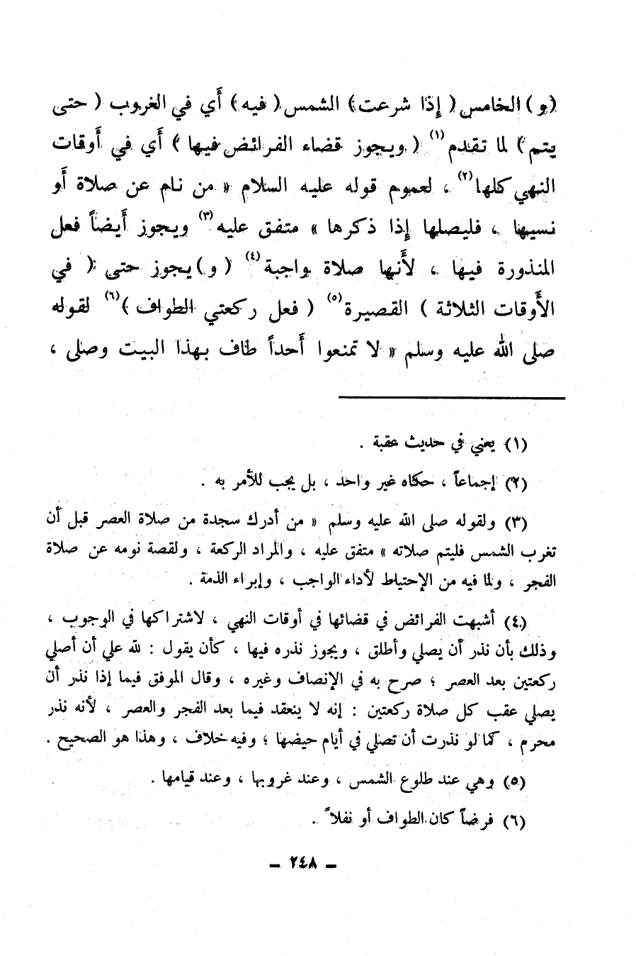 (¬4) أشبهت الفرائض في قضائها في أوقات النهي، لاشتراكها في الوجوب وذلك بأن نذر أن يصلي وأطلق، ويجوز نذره فيها، كأن يقول: لله علي أن أصلي ركعتين بعد العصر، صرح به في الإنصاف وغيره، وقال الموفق فيما إذا نذر أن يصلي عقب كل صلاة ركعتين: إنه لا ينعقد فيما بعد الفجر والعصر، لأنه نذر محرم، كما لو نذرت أن تصلي في أيام حيضها، وفيه خلاف، وهذا هو الصحيح.