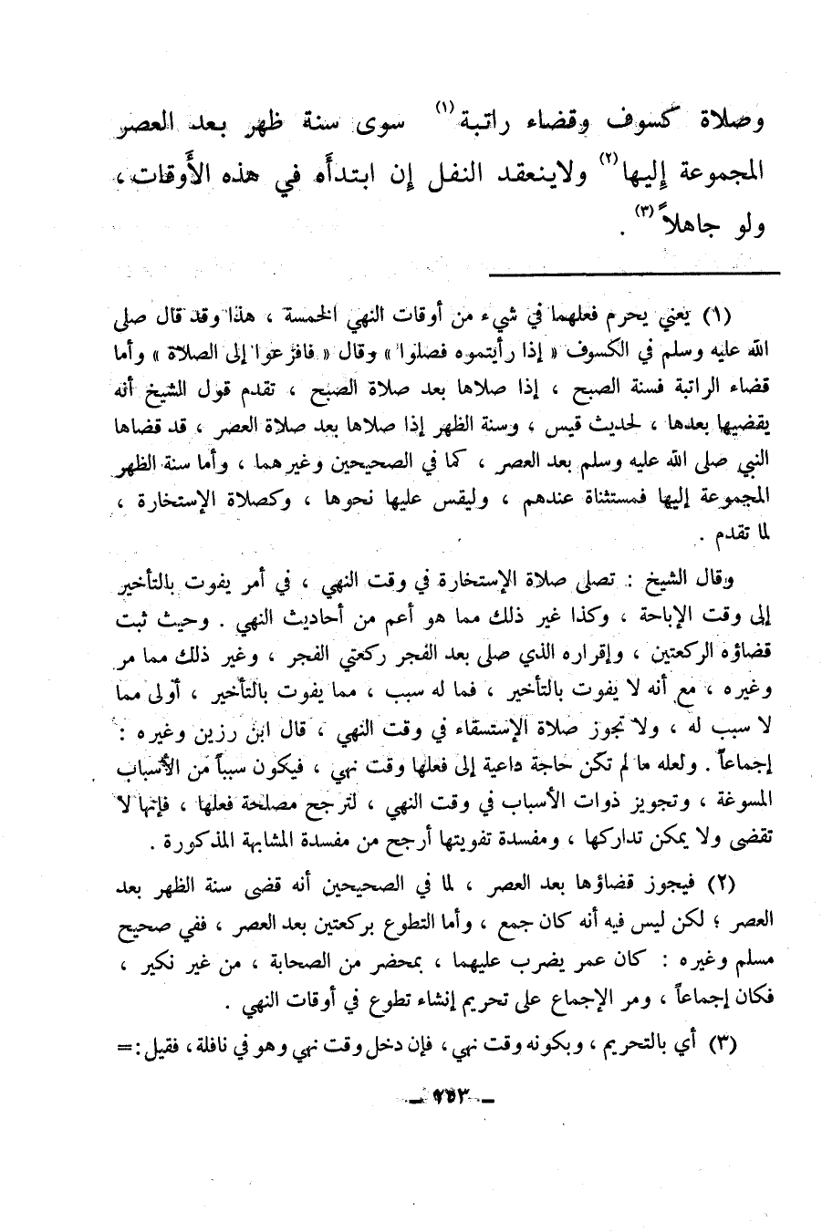 (¬1) يعني يحرم فعلهما في شيء من أوقات النهي الخمسة، هذا وقد قال صلى الله عليه وسلم في الكسوف «إذا رأيتموه فصلوا» وقال «فافزعوا إلى الصلاة» وأما قضاء الراتبة فسنة الصبح، إذا صلاها بعد صلاة الصبح، تقدم قول الشيخ أنه يقضيها بعدها، لحديث قيس، وسنة الظهر إذا صلاها بعد صلاة العصر، قد قضاها النبي صلى الله عليه وسلم بعد العصر، كما في الصحيحين وغيرهما، وأما سنة الظهر المجموعة إليها فمستثناة عندهم، وليقس عليها نحوها، وكصلاة الاستخارة، لما تقدم.