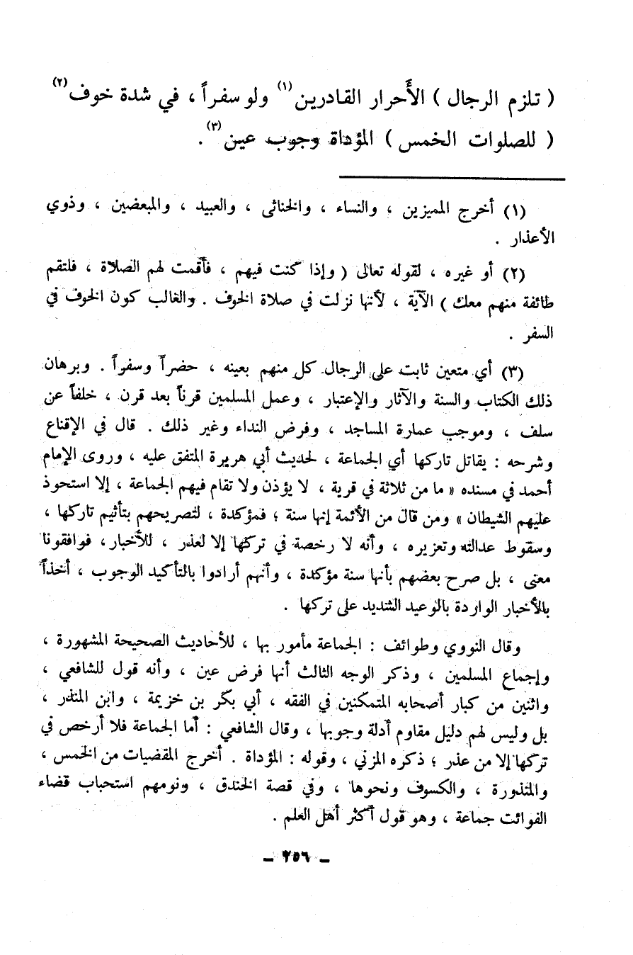 (¬3) أي متعين ثابت على الرجال، كل منهم بعينه، حضرا وسفرا، وبرهان ذلك الكتاب والسنة والآثار والاعتبار، وعمل المسلمين قرنا بعد قرن، خلفا عن سلف، وموجب عمارة المساجد، وفرض النداء وغير ذلك، قال في الإقناع وشرحه: يقاتل تاركها أي الجماعة، لحديث أبي هريرة المتفق عليه، وروى الإمام أحمد في مسنده «ما من ثلاثة في قرية، لا يؤذن ولا تقام فيهم الجماعة، إلا استحوذ عليهم الشيطان» ، ومن قال من الأئمة إنها سنة، فمؤكدة لتصريحهم بتأثيم تاركها، وسقوط عدالته وتعزيره، وأنه لا رخصة في تركها إلا لعذر، للأخبار، فوافقونا معنى، بل صرح بعضهم بأنها سنة مؤكدة، وأنهم أرادوا بالتأكيد الوجوب، أخذا بالأخبار الواردة بالوعيد الشديد على تركها.