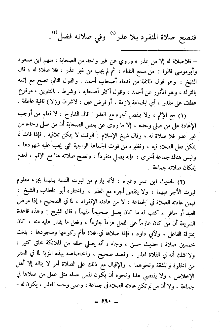 (¬1) مع الإثم، ولا ينقص أجره مع العذر، قال الشارح: لا نعلم من أوجب الإعادة على من صلى وحده، إلا ما روي عن بعض الصحابة أن من صلى وحده من غير عذر فلا صلاة له، وقال شيخ الإسلام: الوقت لا يمكن تلافيه، فإذا فات لم يمكن فعل الصلاة فيه، ونظيره من فوت الجماعة الواجبة التي يجب عليه شهودها، وليس هناك جماعة أخرى، فإنه يصلي منفردا، وتصح صلاته هنا مع الإثم، لعدم إمكان صلاته جماعة.