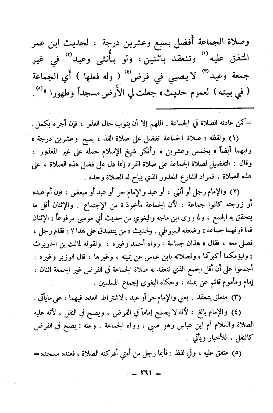 (¬1) ولفظه «صلاة الجماعة تفضل على صلاة الفذ بسبع وعشرين درجة» وفيهما أيضا بخمس وعشرين وأنكر شيخ الإسلام حمله على غير المعذور وقال: التفضيل لصلاة الجماعة على صلاة الفرد إنما دل على فضل هذه الصلاة، على هذه الصلاة، فمراد الشارع المعذور الذي يباح له الصلاة وحده.
