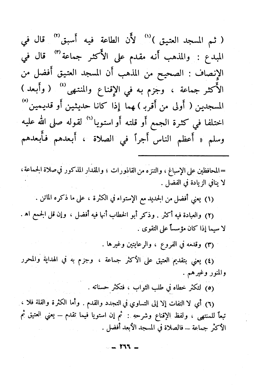 (ثم المسجد العتيق) (¬1) لأن الطاعة فيه أسبق (¬2) قال في المبدع: والمذهب أنه مقدم على الأكثر جماعة (¬3) قال في الإنصاف: الصحيح من المذهب أن المسجد العتيق أفضل من الأكثر جماعة، وجزم به في الإقناع والمنتهى (¬4) (وأبعد) المسجدين (أولى من أقربـ) ـهما إذا كانا حديثين أو قديمين (¬5) اختلفا في كثرة الجمع أو قلته أو استويا (¬6) لقوله صلى الله عليه وسلم «أعظم الناس أجرا في الصلاة، أبعدهم فأبعدهم
