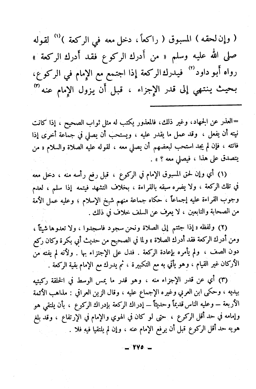 (¬2) ولفظه «إذا جئتم إلى الصلاة ونحن سجود فاسجدوا ولا تعدوها شيئا، ومن أدرك الركعة فقد أدرك الصلاة» ، ولما في الصحيح من حديث أبي بكرة وكان ركع دون الصف، ولم يأمره بإعادة الركعة، فدل على الاجتزاء بها، ولأنه لم يفته من الأركان غير القيام، وهو يأتي به مع التكبيرة، ثم يدرك مع الإمام بقية الركعة.