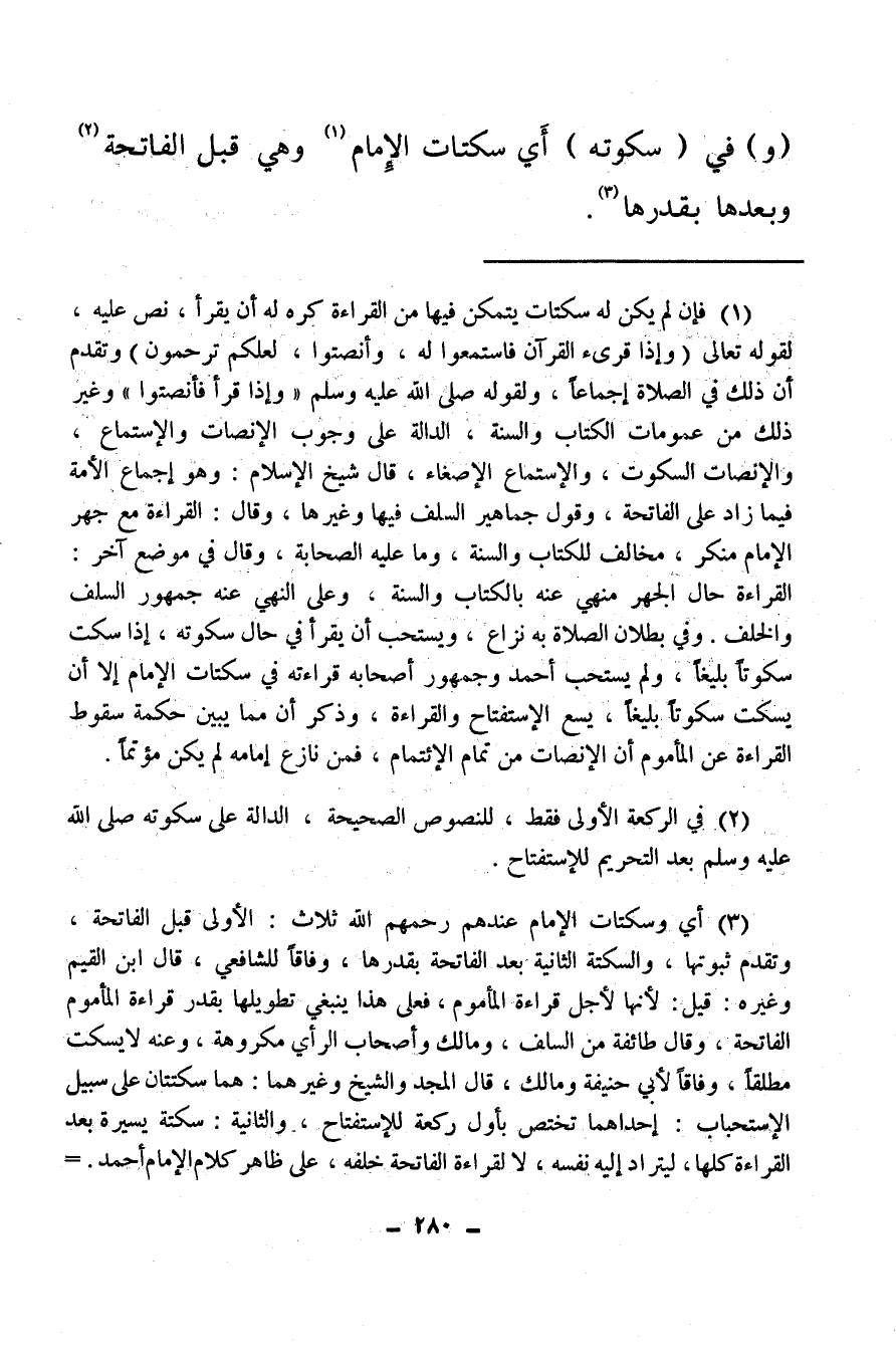 (¬3) أي وسكتات الإمام عندهم رحمهم الله ثلاث: الأولى قبل الفاتحة، وتقدم ثبوتها، والسكتة الثانية بعد الفاتحة بقدرها، وفاقا للشافعي، قال ابن القيم وغيره، قيل: لأنها لأجل قراءة المأموم فعلى هذا ينبغي تطويلها بقدر قراءة المأموم الفاتحة، وقال طائفة من السلف، ومالك وأصحاب الرأي مكروهة، وعنه لا يسكت مطلقا، وفاقا لأبي حنيفة ومالك، قال المجد والشيخ وغيرهما، هما سكتتان على سبيل الاستحباب، إحداهما تختص بأول ركعة للاستفتاح، والثانية سكتة يسيرة بعد القراءة كلها، ليتراد إليه نفسه، لا لقراءة الفاتحة خلفه، على ظاهر كلام الإمام أحمد