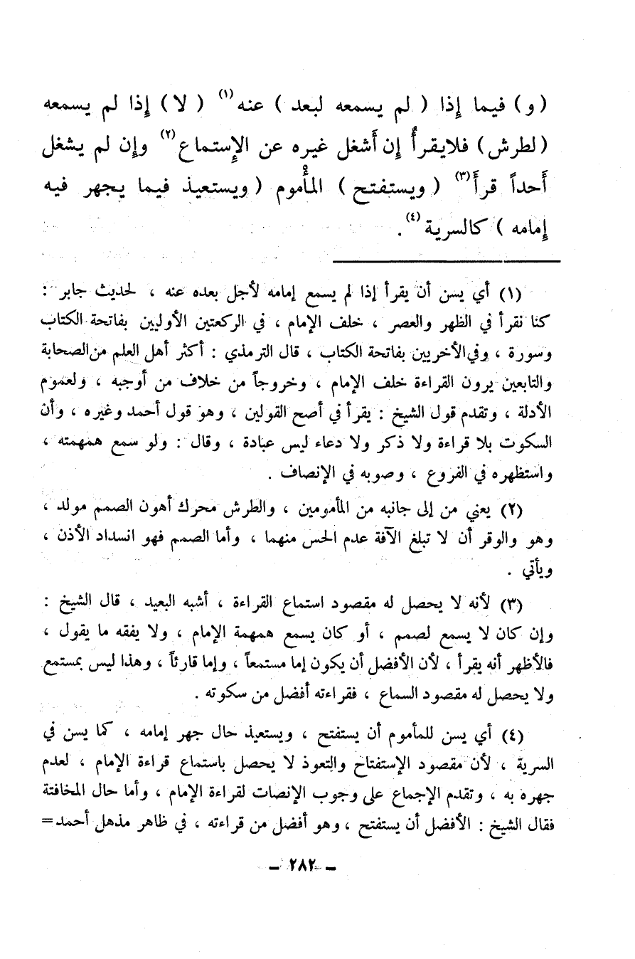 (¬3) لأنه لا يحصل له مقصود استماع القراءة، أشبه البعيد، قال الشيخ: وإن كان لا يسمع لصمم، أو كان يسمع همهمهمة الإمام، ولا يفقه ما يقول، فالأظهر أن يقرأ لأن الأفضل أن يكون إما مستمعًا وإما قارئًا، وهذا ليس بمستمع ولا يحصل له مقصود السماع، فقراءته أفضل من سكوته.