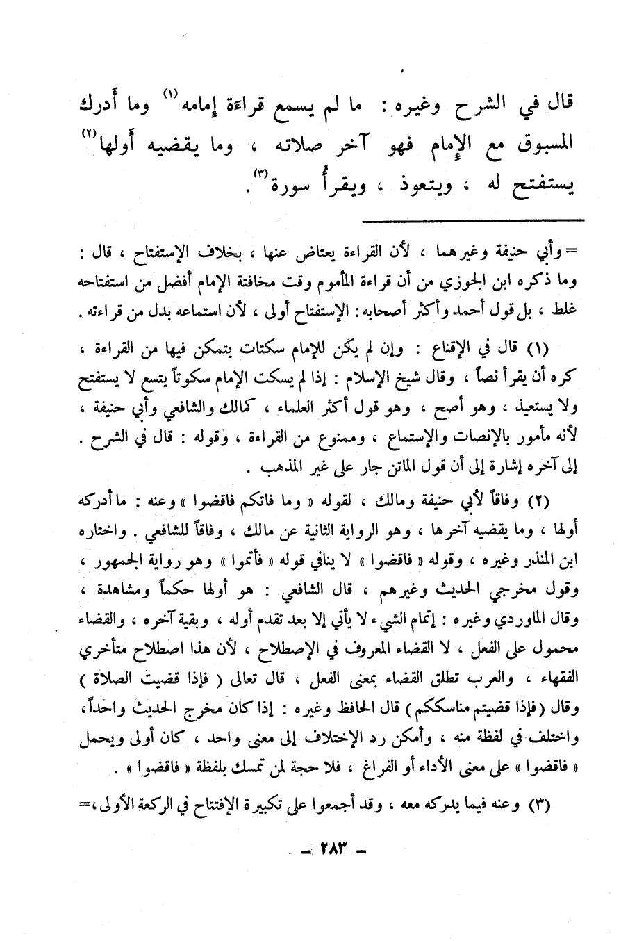 (¬2) وفاقا لأبي حنيفة ومالك، لقوله: «وما فاتكم فاقضوا» وعنه: ما أدركه أولها، وما يقضيه آخرها، وهو الرواية الثانية عن مالك، وفاقا للشافعي: واختاره ابن المنذر وغيره، وقوله: «فاقضوا» لا ينافي قوله «فأتموا» وهو رواية الجمهور وقول مخرجي الحديث وغيرهم، قال الشافعي: هو أولها حكما ومشاهدة، وقال الماوردي وغيره: إتمام الشيء لا يأتي إلا بعد تقدم أوله، وبقية آخره، والقضاء محمول على الفعل، لا القضاء المعروف في الاصطلاح لأن هذا اصطلاح متأخري الفقهاء، والعرب تطلق القضاء بمعنى الفعل، قال تعالى: {فَإِذَا قُضِيَتِ الصَّلاةُ} وقال: {فإذا قضيت مناسككم} قال الحافظ وغيره: إذا كان مخرج الحديث واحدا، واختلف في لفظة منه، وأمكن رد الاختلاف إلى معنى واحد، كان أولى ويحمل فاقضوا على معنى الأداء أو الفراغ، فلا حجة لمن تمسك بلفظة فاقضوا.