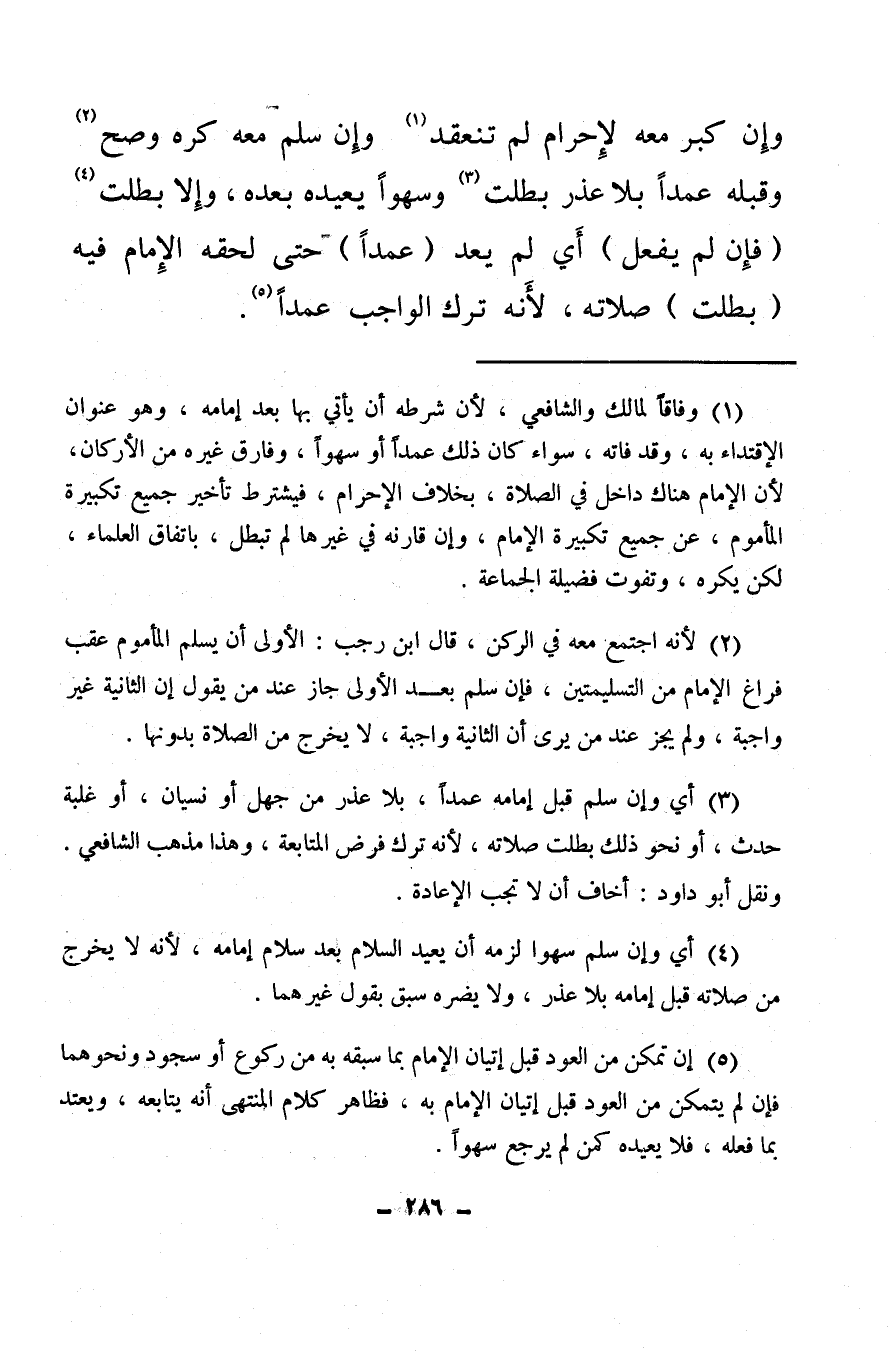 (¬3) أي وإن سلم قبل إمامه عمدًا، بلا عذر من جهل أو نسيان، أو غلبة حدث، أو نحو ذلك بطلت صلاته، لأنه ترك فرض المتابعة، وهذا مذهب الشافعي، ونقل أبو داود: أخاف أن لا تجب الإعادة.