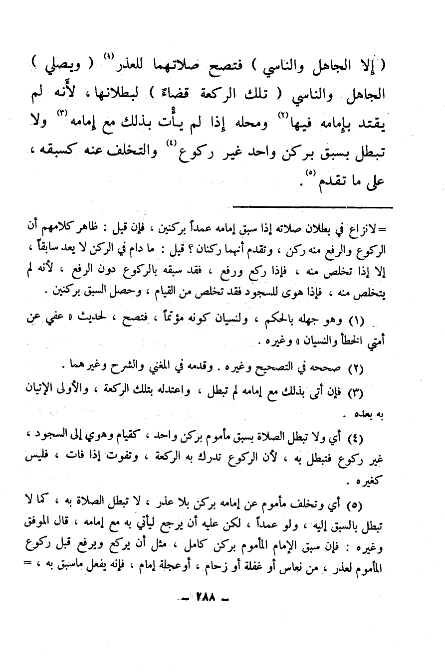 (¬5) أي وتخلف مأموم عن إمامه بركن بلا عذر، لا تبطل الصلاة به، كما لا تبطل بالسبق إليه، ولو عمدًا، لكن عليه أن يرجع ليأتي به مع إمامه، قال الموفق وغيره: فإن سبق الإمام المأموم بركن كامل، مثل أن يركع ويرفع قبل ركوع المأموم لعذر، من نعاس أو غفلة أو زحام أو عجلة إمام فإنه يفعل ما سبق به