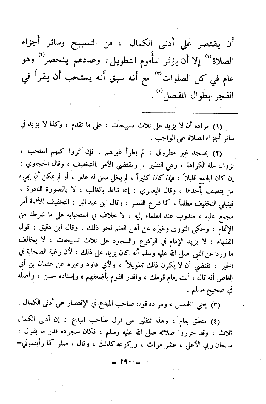 أن يقتصر على أدنى الكمال، من التسبيح وسائر أجزاء الصلاة (¬1) إلا أن يؤثر المأموم التطويل، وعددهم ينحصر (¬2) وهو عام في كل الصلوات (¬3) مع أنه سبق أنه يستحب أن يقرأ في الفجر بطوال المفصل (¬4) .