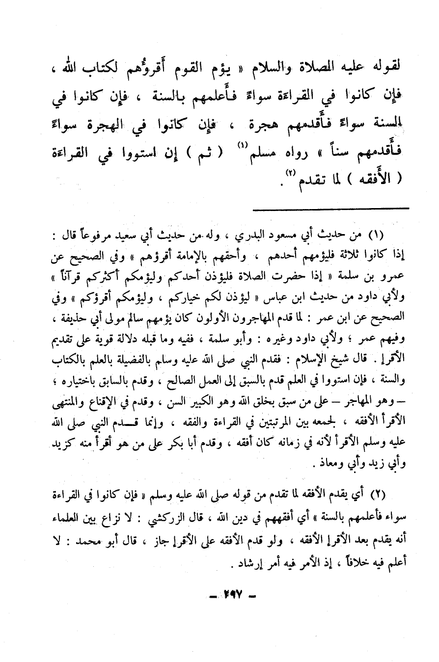 (¬1) من حديث أبي مسعود البدري، وله من حديث أبي سعيد مرفوعًا، قال: «إذا كانوا ثلاثة فليؤمهم أحدهم، وأحقهم بالإمامة أقرؤهم» وفي الصحيح عن عمرو بن سلمة «إذا حضرت الصلاة فليؤذن أحدكم وليؤمكم أكثركم قرآنا» ولأبي داود من حديث ابن عباس «ليؤذن لكم خياركم، وليؤمكم أقرؤكم» ، وفي الصحيح عن ابن عمر: لما قدم المهاجرون الأولون كان يؤمهم سالم مولى أبي حذيفة، وفيهم عمر، ولأبي داود وغيره، وأبو سلمة ففيه وما قبله دلالة قوية على تقديم الأقرأ قال شيخ الإسلام، فقدم النبي صلى الله عليه وسلم بالفضيلة بالعلم بالكتاب والسنة، فإن استووا في العلم قدم بالسبق إلى العمل الصالح، وقدم بالسابق باختياره - وهو المهاجر - على من سبق بخلق الله وهو الكبير السن، وقدم في الإقناع والمنتهى الأقرأ الأفقه، لجمعه بين المرتبتين في القراءة والفقه، وإنما قدم النبي صلى الله عليه وسلم الأقرأ لأنه في زمانه كان أفقه، وقدم أبا بكر على من هو أقرأ منه كزيد وأبي زيد وأبي ومعاذ.
