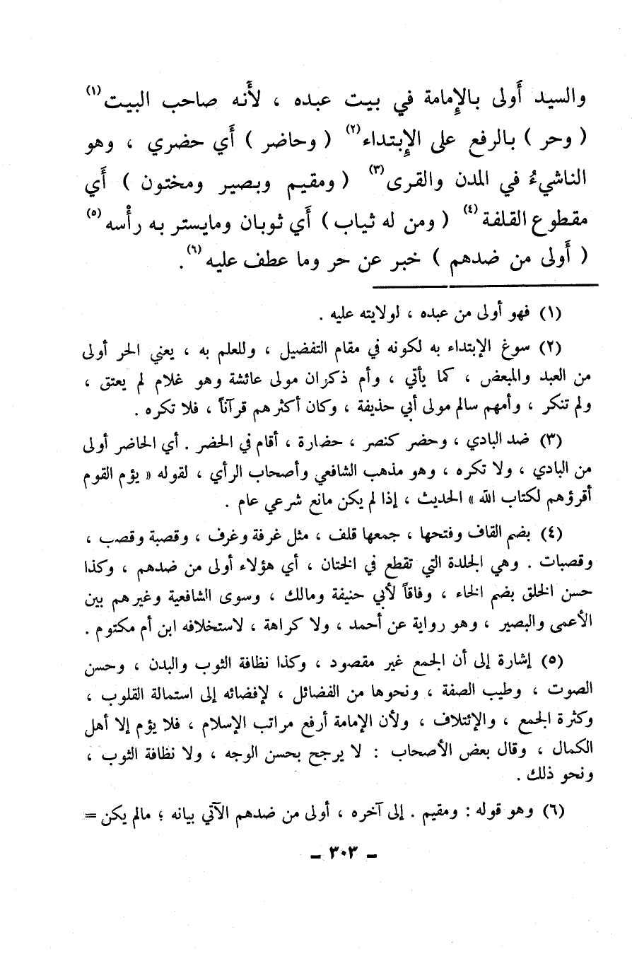 والسيد أولى بالإمامة في بيت عبده، لأنه صاحب البيت (¬1) (وحر) بالرفع على الابتداء (¬2) (وحاضر) أي حضري، وهو الناشئ في المدن والقرى (¬3) (ومقيم وبصير ومختون) أي مقطوع القلفة (¬4) و (ومن له ثياب) أي ثوبان وما يستر به رأسه (¬5) (أولى من ضدهم) خبر عن حر وما عطف عليه (¬6) .