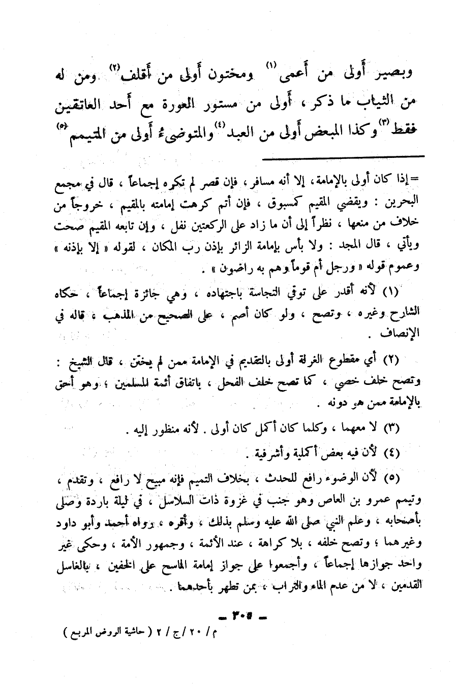 (¬5) لأن الوضوء رافع للحدث، بخلاف التيمم فإنه مبيح لا رافع، وتقدم وتيمم عمر بن العاص، وهو جنب في غزوة ذات السلاسل، في ليلة باردة وصلى بأصحابه، وعلم النبي صلى الله عليه وسلم بذلك، وأقره، رواه أحمد وأبو داود وغيرهما، وتصح خلفه، بلا كراهة عند الأئمة وجمهور الأمة، وحكى غير واحد جوازها إجماعًا، وأجمعوا على جواز إمامة الماسح على الخفين، بالغاسل القدمين لا من عدم الماء والتراب بمن تطهر بأحدهما.