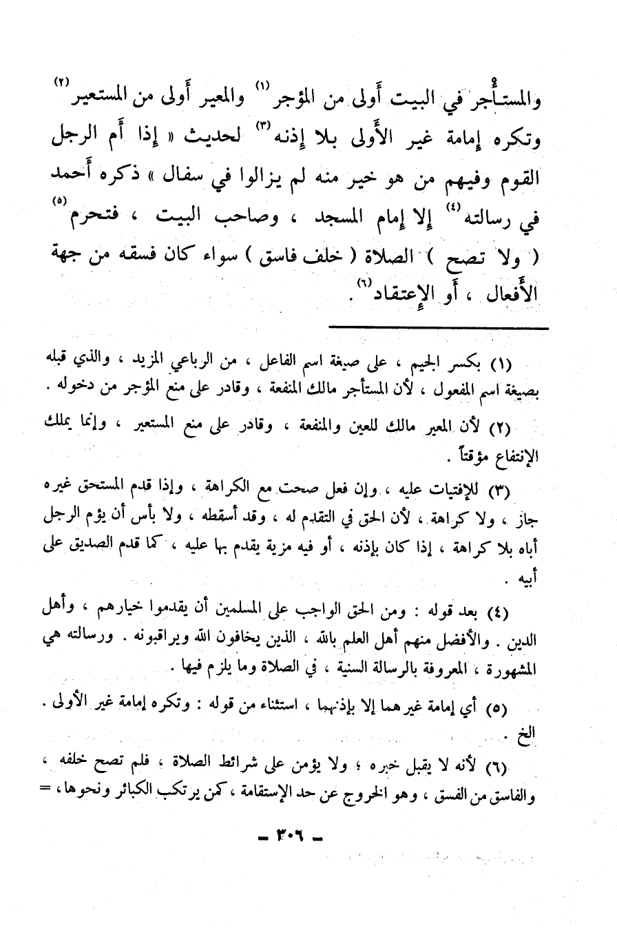 والمستأجر في البيت أولى من المؤجر (¬1) والمعير أولى من المستعير (¬2) وتكره إمامة غير الأولى بلا إذنه (¬3) لحديث «إذا أم الرجل القوم وفيهم من هو خير منه لم يزلوا في سفال» ، ذكره أحمد في رسالته (¬4) إلا إمام المسجد، وصاحب البيت، فتحرم (¬5) (ولا تصح) الصلاة (خلف فاسق) سواء كان فسقه من جهة الأفعال أو الاعتقاد (¬6) .
