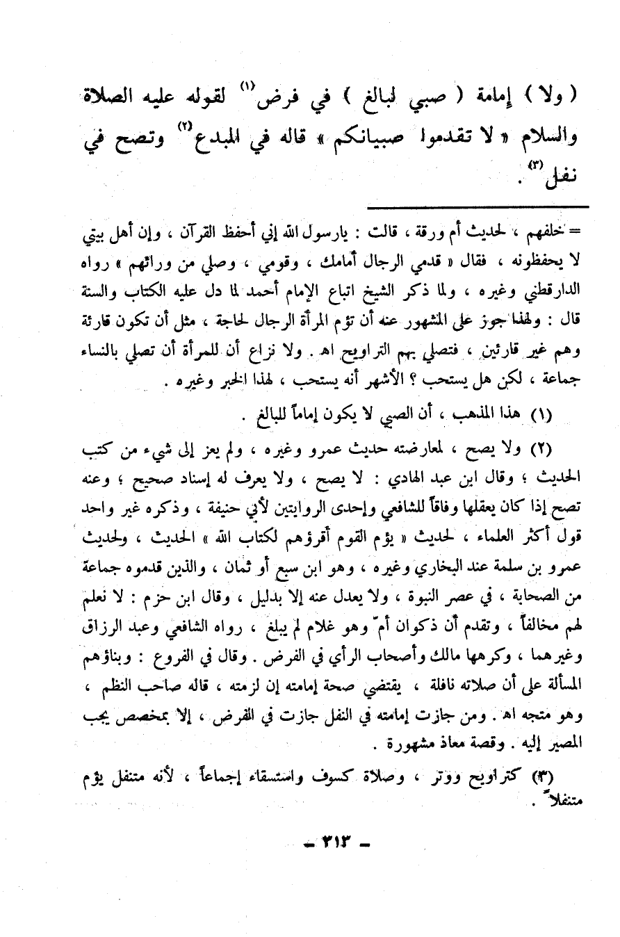 (¬2) ولا يصح لمعارضته حديث عمرو وغيره، ولم يعز إلى شيء من كتب الحديث وقال ابن عبد الهادي: لا يصح ولا يعرف له إسناد صحيح، وعنه تصح إذا كان يعقلها وفاقا للشافعي وإحدى الروايتي لأبي حنيفة، وذكره غير واحد قول أكثر العلماء لحديث «يؤم القوم أقرؤهم لكتاب الله» ، الحديث ولحديث عمرو بن سلمة عند البخاري وغيره، وهو ابن سبع أو ثمان، والذين قدموه جماعة من الصحابة في عصر النبوة ولا يعدل عنه إلا بدليل، وقال ابن حزم، لا نعلم لهم مخالفا، وتقدم أن ذكوان أم وهو غلام لم يبلغ، رواه الشافعي وعبد الرزاق وغيرهم، وكرهها مالك وأصحاب الرأي في الفرض، وقال في الفروع، وبناؤهم المسألة على أن صلاتهم نافلة، ويقتضي صحة إمامته إن لزمته، قاله صاحب النظم وهو متجه اهـ ومن جازت إمامته في النفل جازت في الفرض، إلا بمخصص يجب المصير وقصة معاذ مشهورة.