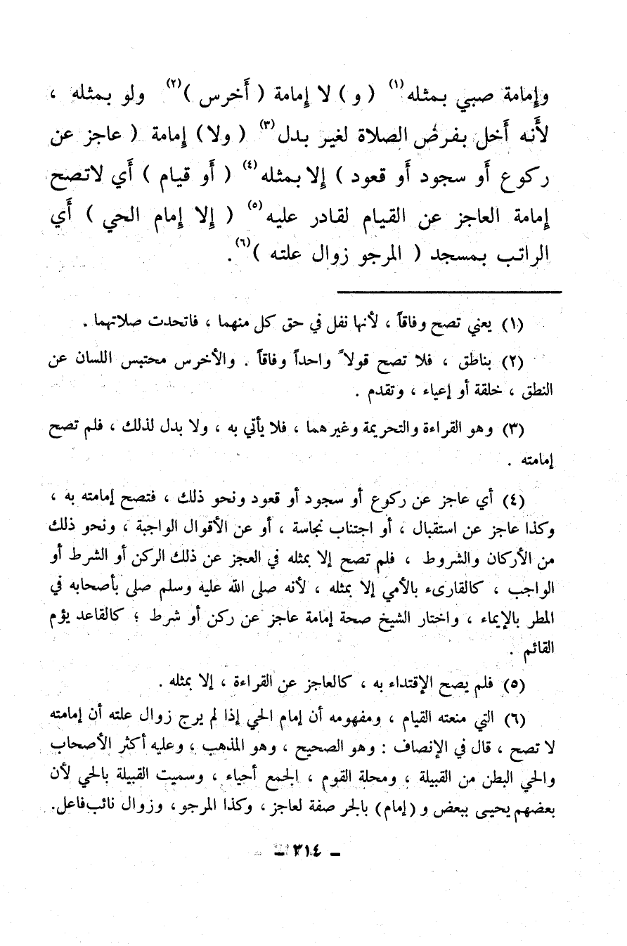 (¬4) أي عاجز عن ركوع أو سجود أو قعود ونحو ذلك، فتصح إمامته به، وكذا عاجز عن استقبال، أو اجتناب نجاسة، أو عن الأقوال الواجبة، ونحو ذلك من الأركان والشروط، فلم تصح إلا بمثله في العجز عن ذلك الركن أو الشرط أو الواجب، كالقارئ بالأمي إلا بمثله، لأنه صلى الله عليه وسلم صلى بأصحابه في المطر بالإيماء، واختار الشيخ صحة إمامة عاجز عن ركن أو شرط كالقاعد يؤم القائم.