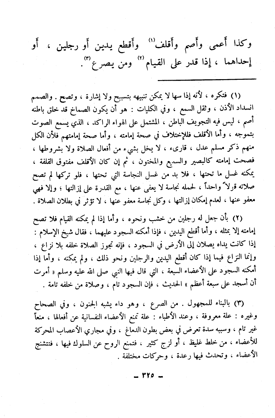 (¬2) بأن جعل له رجلين من خشب ونحوه، وأما إذا لم يمكنه القيام فلا تصح إمامته إلا بمثله، وأما أقطع اليدين، فإذا أمكنه السجود عليهما فقال شيخ الإسلام: إذا كانت يداه يصلان إلى الأرض في السجود، فإنه تجوز الصلاة خلفه بلا نزاع، وإنما النزاع فيما إذا كان أقطع اليدين والرجلين ونحو ذلك، ولم يمكنه وأما إذا أمكنه السجود على الأعضاء السبعة، التي قال فيها النبي صلى الله عليه وسلم «أمرت أن أسجد على سبعة أعظم» ، الحديث، فإن السجود تام، وصلاة من خلفه تامة.