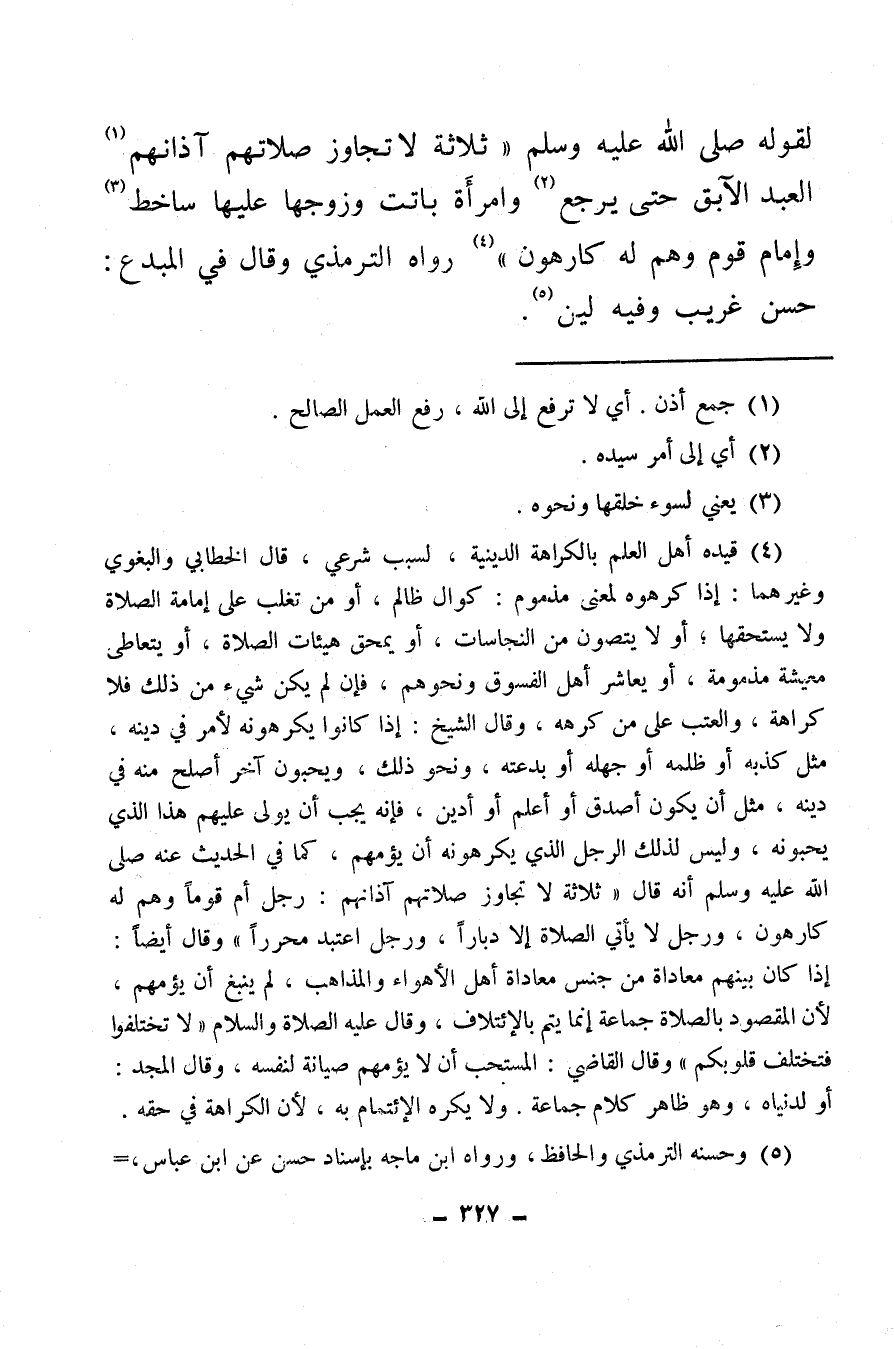 (¬4) قيده أهل العلم بالكراهة الدينية، لسبب شرعي، قال الخطابي والبغوي وغيرهما، إذا كرهوا لمعنى مذموم، كوالٍٍٍ ظالم، أو من تغلب على إمامة الصلاة ولا يستحقها، أو لا يتصون من النجاسات، أو يمحق هيئات الصلاة، أو يتعاطى معيشة مذمومة، أو يعاشر أهل الفسوق ونحوهم، فإن لم يكن شيء من ذلك فلا كراهة، والعتب على من كرهه، وقال الشيخ: إذا كانوا يكرهونه لأمر في دينه مثل كذبه أو ظلمه أو جهله أو بدعته ونحو ذلك، ويحبون آخر أصلح منه في دينه، مثل أن يكون أصدق أو أعلم أو أدين، فإنه يجب أن يولي عليهم هذا الذي يحبونه، وليس لذلك الرجل الذي يكرهونه أن يؤمنهم، كما في الحديث عنه صلى الله عليه وسلم أنه قال: «ثلاثة لا تجاوز صلاتهم آذانهم: رجل أم قومًا وهم له كارهون، ورجل لا يأتي الصلاة إلا دبارًا، ورجل اعتبد محررا» وقال أيضا: إذا كان بينهم معاداة من جنس معاداة أهل الأهواء والمذاهب لم ينبغ أن يؤمهم لأن المقصود بالصلاة جماعة إنما يتم الائتلاف وقال عليه الصلاة والسلام «لاتختلفوا فتختلف قلوبكم» وقال القاضي: المستحب أن لا يؤمهم صيانة لنفسه، وقال المجد: أو لدنياه، وهو ظاهر كلام جماعة، ولا يكره الائتمام به، لأن الكراهة في حقه.