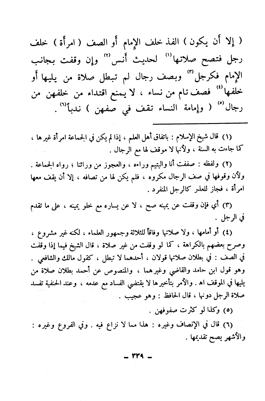 (¬4) أو أمامها، ولا صلاتها وفاقا للثلاثة وجمهور العلماء، لكنه غير مشروع، وصرح بعضهم بالكراهة، كما ولو وقفت من غير صلاة، قال الشيخ فيما إذا وقفت في الصف: في بطلان صلاتها قولان، أحدهما لا تبطل، كقول مالك والشافعي، وهو قول ابن حامد والقاضي وغيرهما: والمنصوص عن أحمد بطلان صلاة من يليها في الموقف اهـ والأمر بتأخيرها لا يقتضي الفساد مع عدمه، وعند الحنفية تفسد صلاة الرجل دونها، قال الحافظ وهو عجيب.