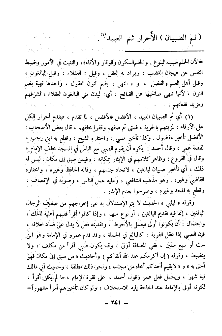 (¬1) أي ثم الصبيان العبيد، الأفضل، فالأفضل، لما تقدم فيقدم أحرار الكل على الأرقاء لمزيتهم بالحرية، فمتى تم صفهم وفقوا خلفهم، قال بعض الأصحاب الأفضل تأخير مفضول وكذا تأخير صبي، واختاره الشيخ، وقطع به ابن رجب، لقصة عمر، وقال أحمد: يكره أن يقوم الصبي مع الناس في المسجد خلف الإمام، وقال في الفروع: وظاهر كلامهم في الإيثار بمكانه وفيمن سبق إلى مكان، ليس له ذلك، أي تأخير صبيان لبالغين لاتحاد جنسهم، وقاله الحافظ وغيره، واختاره القاضي وغيره، وهو مذهب الشافعي، وعليه عمل الناس، وصوبه في الإنصاف وقطع به المجد وغيره، وصرحوا بعدم الإيثار.
