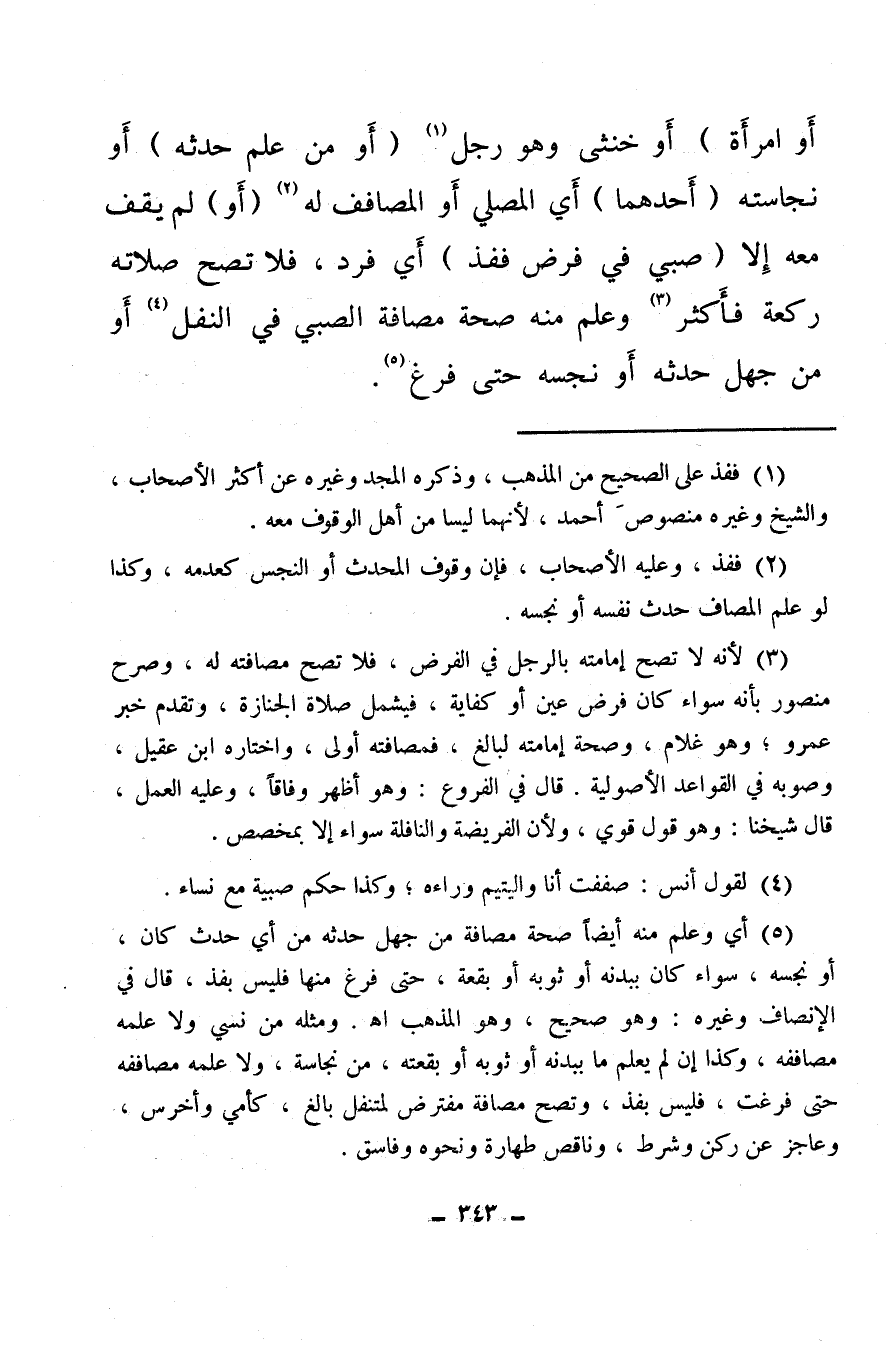 (¬3) لأنه لا تصح إمامته بالرجل في الفرض، فلا تصح مصافته له وصرح منصور بأنه سواء كان فرض عين أو كفاية، فيشمل صلاة الجنازة، وتقدم خبر عمرو وهو غلام وصحة إمامته لبالغ فمصافته أولى واختاره ابن عقيل وصوبه في القواعد الأصولية، قال في الفروع: وهو أظهر وفاقا، وعليه العمل، قال شيخنا: وهو قول قوي: ولأن الفريضة والنافلة سواء إلا بمخصص.