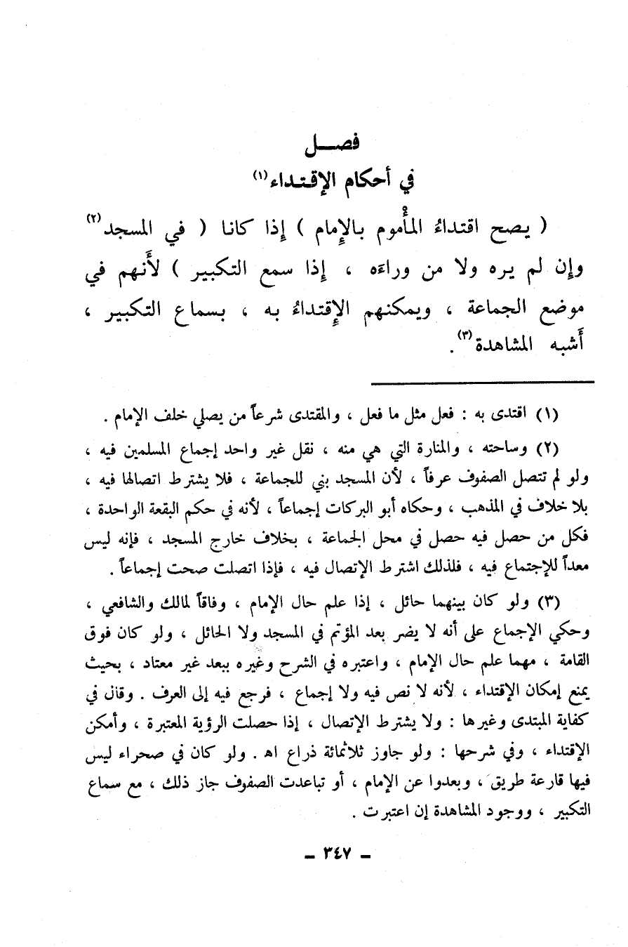 (¬3) ولو كان بينهما حائل، إذا علم حال الإمام، وفاقا لمالك والشافعي، وحكي الإجماع على أنه لا يضر بعد المؤتم في المسجد ولا الحائل ولو كان فوق القامة، مهما علم حال الإمام، واعتبره في الشرح وغيره ببعد غير معتاد بحيث يمنع إمكان الاقتداء لأنه لا نص فيه ولا إجماع، فرجع فيه إلى العرف، وقال في كفاية المبتدي وغيرها، ولا يشترط الاتصال، إذا حصلت الرؤية المعتبرة، وأمكن الاقتداء وفي شرحها، ولو جاوز ثلاث مائة ذراع اهـ ولو كان في صحراء ليس فيها قارعة طريق، وبعدوا عن الإمام، أو تباعدت الصفوف جاز ذلك، مع سماع التكبير، ووجود المشاهدة إن اعتبرت.