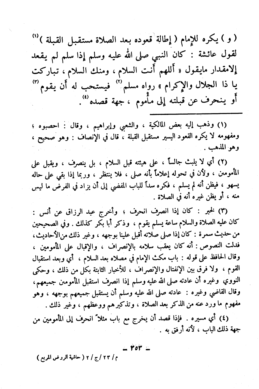 (¬3) لخبر: كان إذا انصرف انحرف، وأخرج عبد الرزاق عن أنس: كان عليه الصلاة والسلام ساعة يسلم يقوم، وذكر أبا بكر كذلك وفي الصحيحين من حديث سمرة، كان إذاصلى صلاته أقبل علينا بوجهه، وغير ذلك من الأحاديث، فدلت النصوص، أنه كان يعقب سلامه بالانصراف، والإقبال على المأمومين وقال الحافظ على قوله: باب مكث الإمام في مصلاه بعد السلام، أي وبعد استقبال القوم، ولا فرق بين الانفتال والانصراف، للأخبار الثابتة بكل من ذلك، وحكى النووي وغيره أن عادته صلى الله عليه وسلم إذا انصرف استقبل المأمومين جميعهم وقال القاضي وغيرهم، عادته صلى الله عليه وسلم أن يستقبل جميعهم بوجهه، وهو مفهوم ما ورد عنه من الذكر بعد الصلاة، وتذكيرهم ووعظهم وغير ذلك.