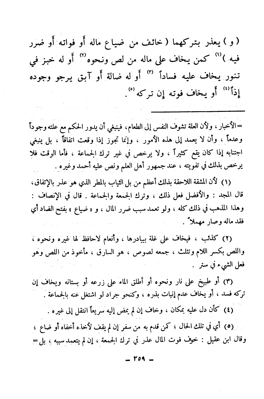 (¬5) أي في تلك الحال، كمن قدم به من سفر إن لم يقف لأخذه أخفاه أو ضاع، وقال ابن عقيل: خوف فوت المال عذر في ترك الجمعة إن لم يتعمد سببه بل حصل اتفاقا، وقال المجد: الأفضل ترك ما يرجو وجوده ويصلي الجمعة والجماعة، لأن ما عند الله خير وأبقى، وربما لا ينفعه حذره، وهذا والله أعلم ما لم يتشوش خاطره فإن لب الصلاة الخشوع.