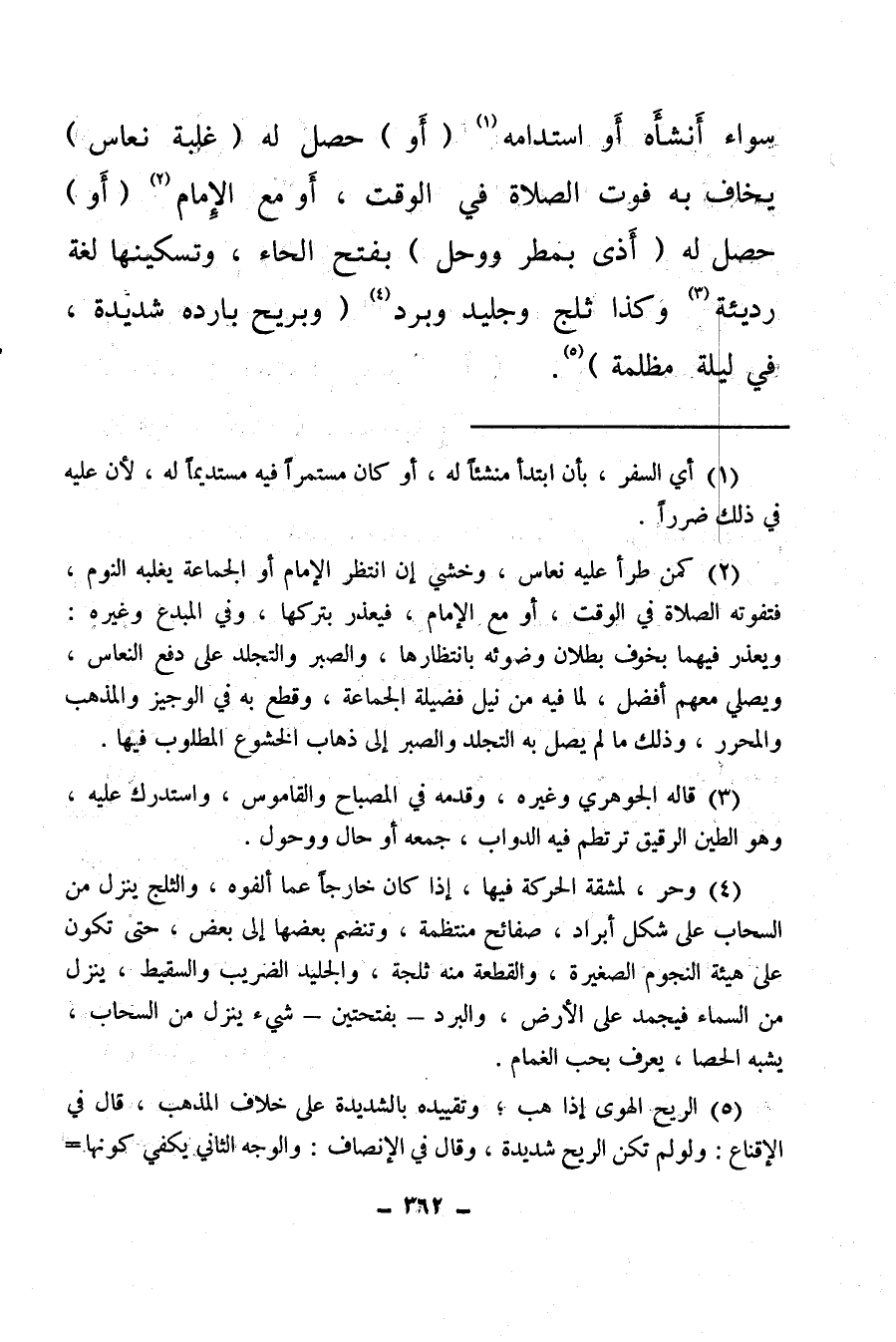 (¬2) كمن طرأ عليه نعاس، وخشي إن انتظر الإمام أو الجماعة يغلبه النوم، فتفوته الصلاة في الوقت، أو مع الإمام، فيعذر بتركها وفي المبدع وغيره، ويعذر فيهما بخوف بطلان وضوئه بانتظارها، والصبر والتجلد على دفع النعاس، ويصلي معهم أفضل لما فيه من نيل فضيلة الجماعة، وقطع به في الوجيز والمذهب والمحرر، وذلك ما لم يصل به التجلد والصبر إلى ذهاب الخشوع المطلوب فيها.