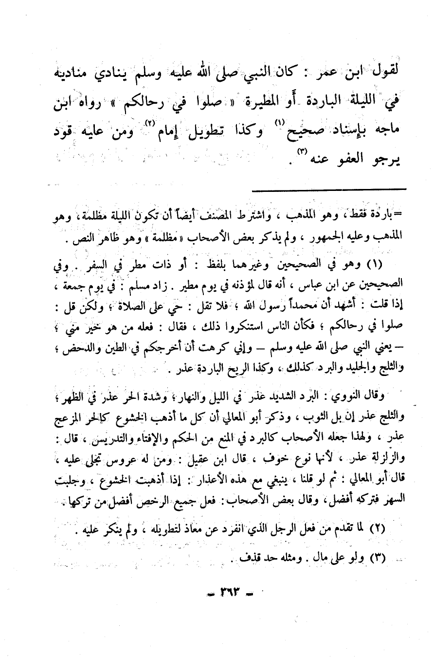 (¬1) وهو في الصحيحين وغيرهما بلفظ: «أو ذات مطر في السفر» ، وفي الصحيحين عن ابن عباس، أنه قال لمؤذنه في يوم مطير، زاد مسلم، في يوم جمعة إذا قلت: أشهد أن محمدا رسول الله، فلا تقل: حي على الصلاة، ولكن قل: صلوا في رحالكم، فكأن الناس استنكروا ذلك، فقال: فعله من هو خير مني يعني النبي صلى الله عليه وسلم وإني كرهت أن أخرجكم في الطين والدحض والثلج والجليد والبرد كذلك، وكذا الريح الباردة عذر. وقال النووي: البرد الشديد عذر في الليل والنهار، وشدة الحر عذر في الظهر والثلج عذر إن بل الثوب، وذكر أبو المعالي أن كل ما أذهب الخشوع كالحر المزعج عذرا ولهذا جعله الأصحاب كالبرد في المنع من الحكم والإفتاء والتدريس قال والزلزلة عذر، لانها نوع خوف قال ابن عقيل: ومن له عروس تجلى عليه، قال أبو المعالي: ثم لو قلنا: ينبغي مع هذه الأعذار: إذا أذهبت الخشوع، وجلبت السهر فتركه أفضل، وقال بعض الأصحاب: فعل جميع الرخص أفضل من تركها.