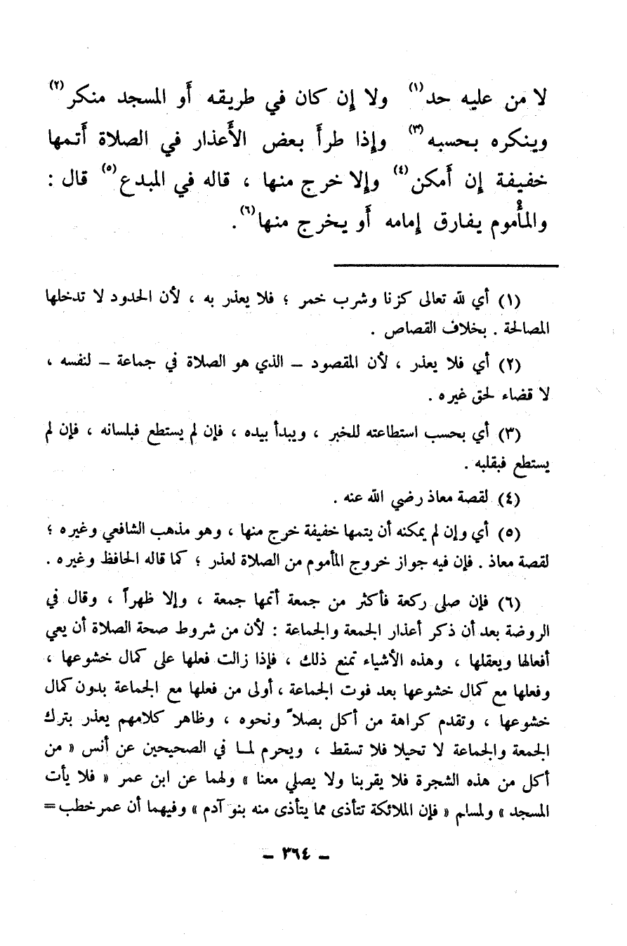 لا من عليه حد (¬1) ولا إن كان في طريقه أو المسجد منكر (¬2) وينكره بحسبه (¬3) وإذا طرأ بعض الأعذار في الصلاة أتمها خفيفة إن أمكن (¬4) وإلا خرج منها، قاله في المبدع (¬5) قال: والمأموم يفارق إمامه أو يخرج منها (¬6) .
