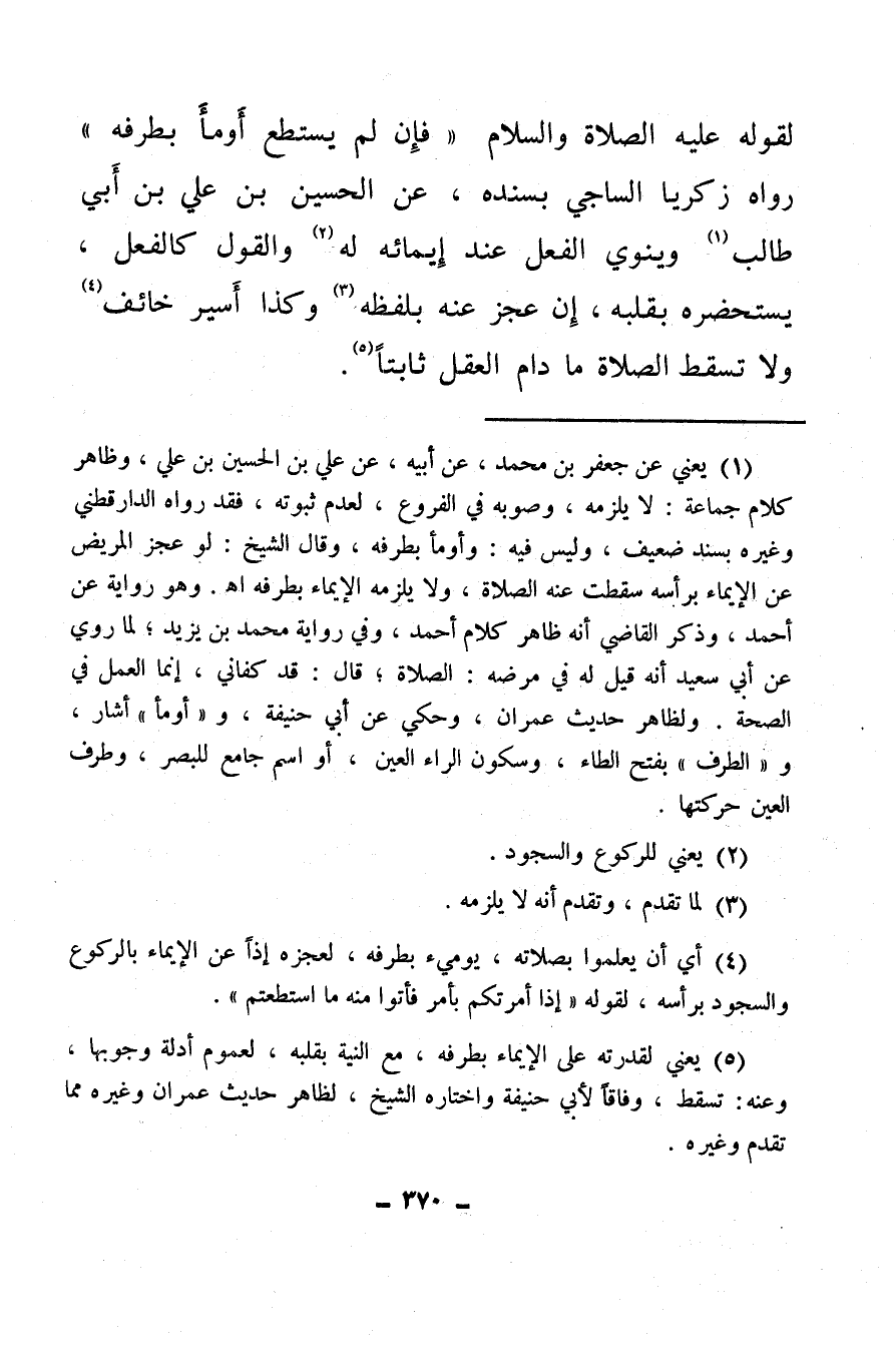 لقوله عليه الصلاة والسلام «فإن لم يستطع أومأ بطرفه» رواه زكريا الساجي بسنده، عن الحسين بن علي بن أبي طالب (¬1) وينوي الفعل عند إيمائه له (¬2) والقول كالفعل، يستحضره بقلبه، إن عجز عنه بلفظه (¬3) وكذا أسير خائف (¬4) ولا تسقط الصلاة ما دام العقل ثابتا (¬5) .