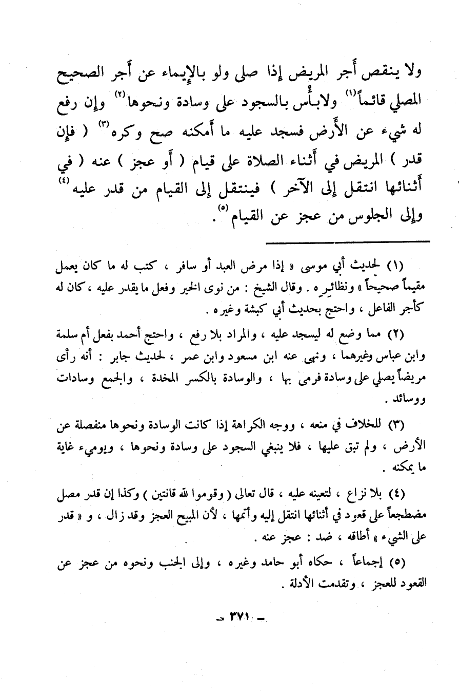 ولا ينقص أجر المريض إذا صلى ولو بالإيماء عن أجر الصحيح المصلي قائما (¬1) ولا بأس بالسجود على وسادة ونحوها (¬2) وإن رفع له شيء عن الأرض فسجد عليه ما أمكنه صح وكره (¬3) فإن قدر، المريض في أثناء الصلاة على قيام (أو عجز) عنه (في أثنائها انتقل إلى الآخر) فينتقل إلى القيام من قدر عليه (¬4) وإلى الجلوس من عجز عن القيام (¬5) .