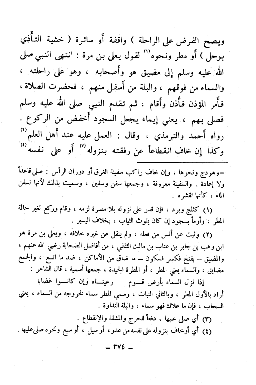 ويصح الفرض على الراحلة واقفة أو سائرة خشية التأذي بوحل أو مطر ونحوه (¬1) لقول يعلى بن مرة، انتهى النبي صلى الله عليه وسلم إلى مضيق هو وأصحابه، وهو على راحلته، والسماء من فوقهم، والبلة من أسفل منهم، فحضرت الصلاة، فأمر المؤذن فأذن وأقام، ثم تقدم النبي صلى الله عليه وسلم فصلى بهم، يعني إيماء يجعل السجود أخفض من الركوع، رواه أحمد والترمذي، وقال: العمل عليه عند أهل العلم (¬2) وكذا إن خاف انقطاعا عن رفقته بنزوله (¬3) أو على نفسه (¬4) .