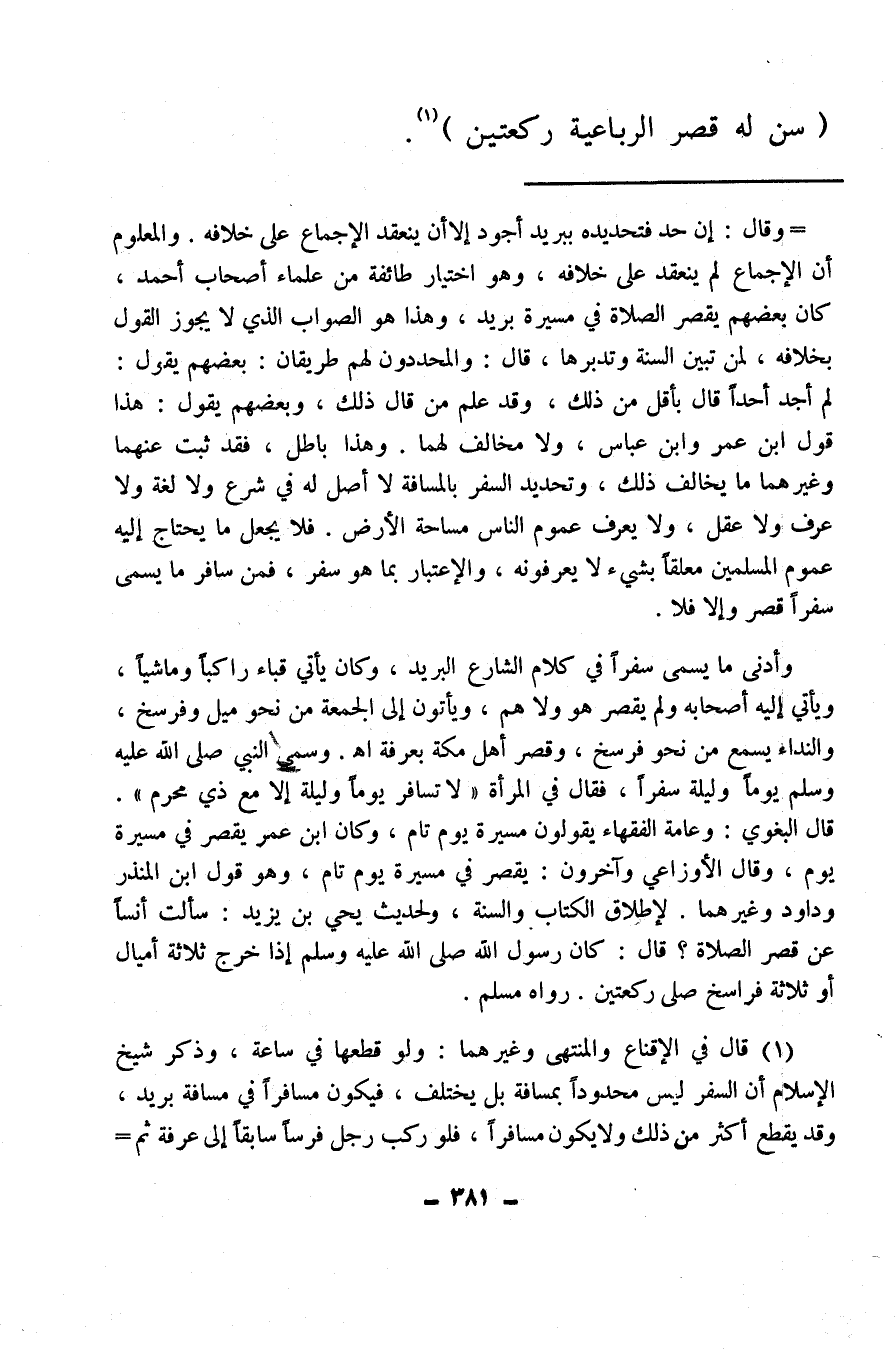 (¬1) قال في الإقناع والمنتهى وغيرهما: ولو قطعها في ساعة، وذكر شيخ الإسلام أن السفر ليس محدودا بمسافة بل يختلف، فيكون مسافرا في مسافة بريد، وقد يقطع أكثر من ذلك ولا يكون مسافرًا، فلو ركب رجل فرسا سابقا إلى عرفة ثم