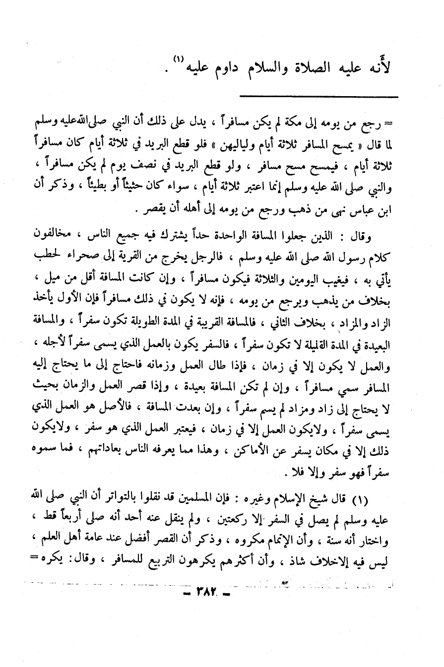 (¬1) قال شيخ الإسلام وغيره: فإن المسلمين قد نقلوا بالتواتر أن النبي صلى الله عليه وسلم لم يصل في السفر إلا ركعتين، ولم ينقل عنه أحد أنه صلى أربعا قط، واختار أنه سنة، وأن الإتمام مكروه، وذكر أن القصر أفضل عند عامة أهل العلم، ليس فيه إلا خلاف شاذ، وأن أكثرهم يكرهون التربيع للمسافر.